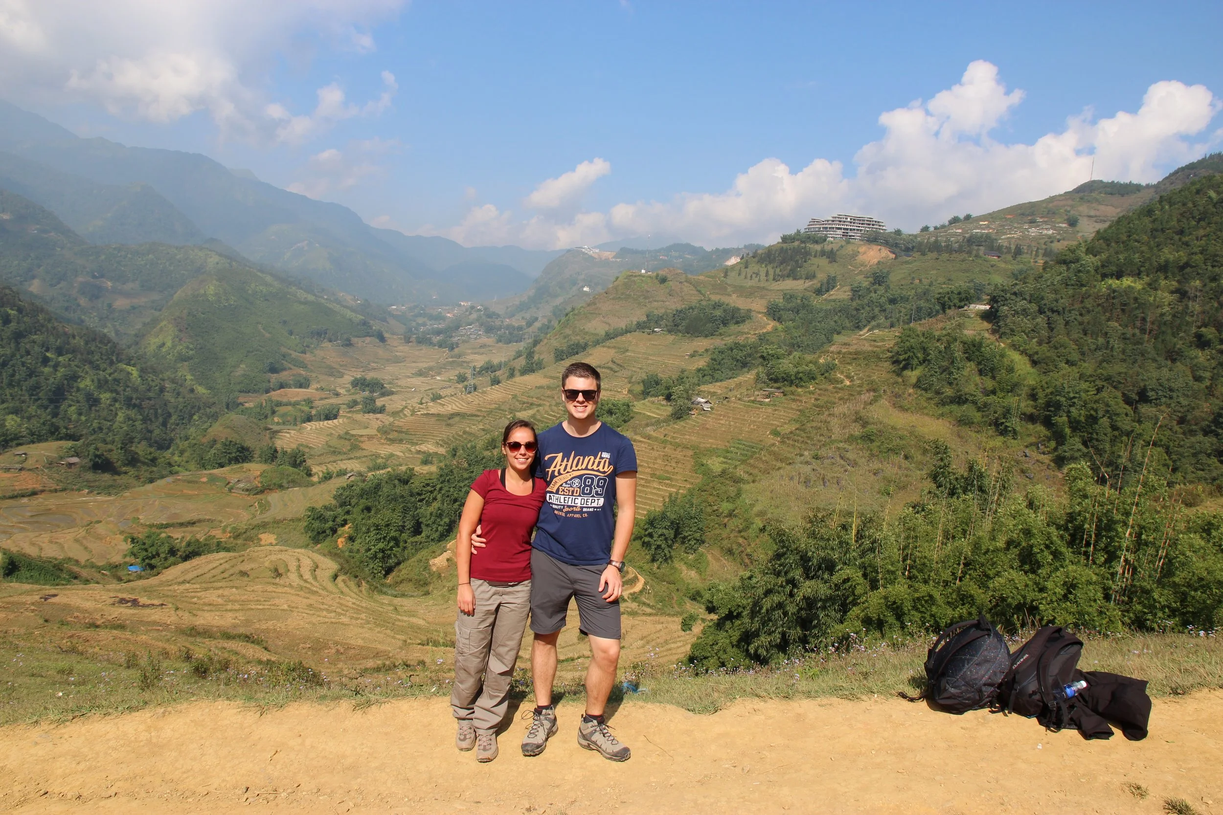 Aangekomen in Sa Pa krijgen we een ontbijt en beginnen we aan een trektocht van 11km naar een bergdorpje waar we zullen overnachten. De eerste landschappen zijn verbluffend! We zitten op ongeveer 1300 meter hoogte en overal waar je kan kijken zie je rijstvelden, bossen en bergen. We worden vergezeld door onze reisgids Pam, haar dochtertje van 11 maanden en 2 vriendinnen uit een ander dorp. Pam is heel vriendelijk en praat relatief goed Engels, wat verbazingwekkend is als je weet dat ze nooit heeft leren schrijven of lezen. Engels heeft ze geleerd van de toeristen waarmee ze enkele keren per week op trektocht gaat.