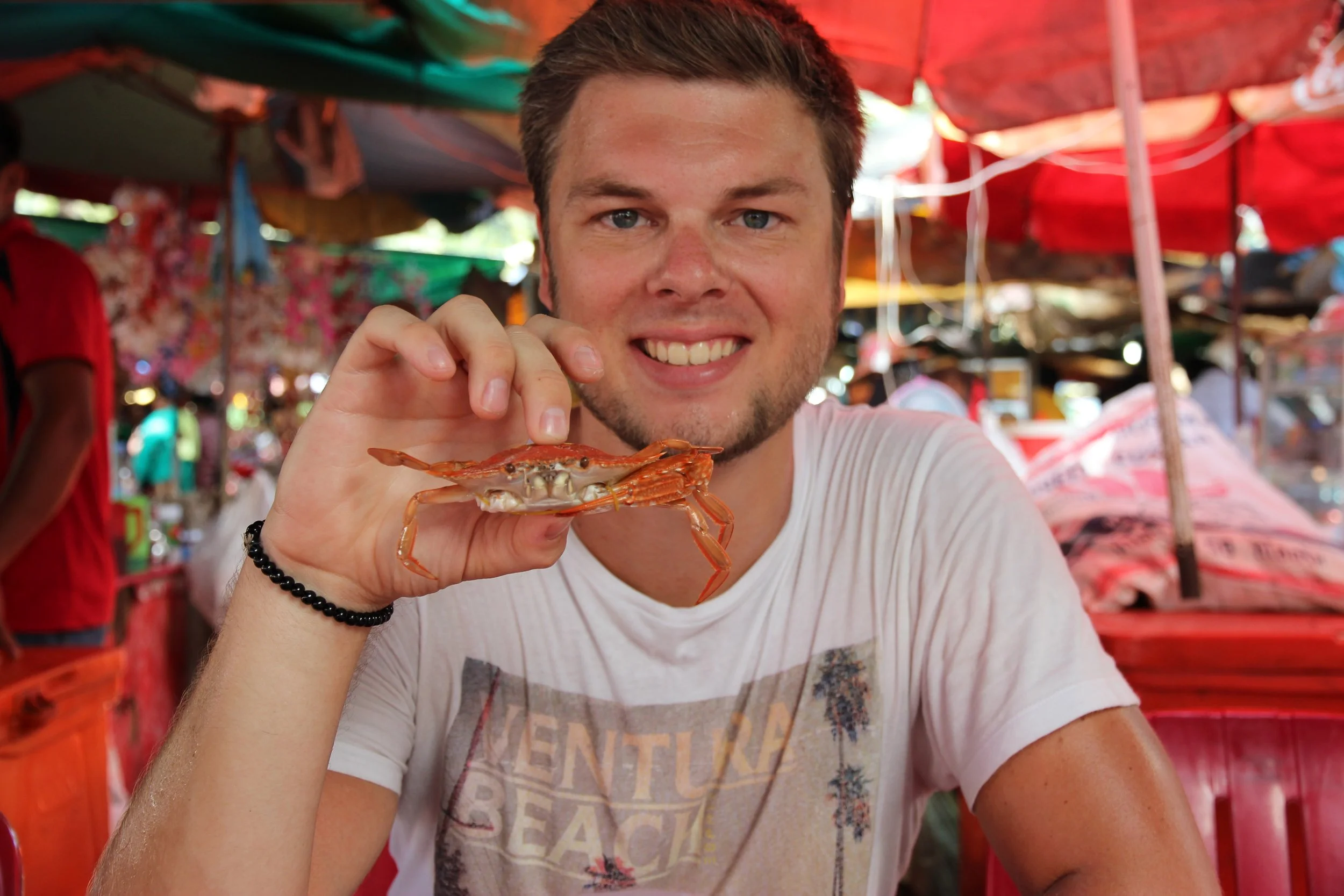 Tijdens onze eerste dag hebben we ’s ochtends een scooter gehuurd om de omgeving te verkennen en naar Kep te rijden. We waren al snel gearriveerd op de crab market waar de krabbetjes vers uit de zee gevangen, verkocht, gekookt en opgegeten worden. Hier willen wij ook aan mee doen! Na een beetje uitzoeken hoe we dit juist moeten aanpakken, wagen we de stap en doen we alsof we echte kenners zijn. Tom onderhandelt over de juiste prijs (5 dollar voor een kilo verse krab) en grijpt mee in de manden om de juiste krabbetjes uit te kiezen. Uiteraard hebben we er geen idee van hoe een ‘goede’ krab te onderscheiden van de minder goede, maar dat hoeven de verkopers niet te weten. Na verder onderhandelen over het koken van de krab (inclusief de 5 dollars) worden we enkele meters verder gebracht naar een dame die onze krabbetjes in een pot met kokend water kiepert. Vijf minuutjes later en we hebben een plastiek zakje vol met verse, gekookte krab. En nu? Weer enkele meters verder zijn er kraampjes die drank en rijst verkopen en waar we onze krab mogen opeten als we iets bestellen. Na wat geklungel en de verkoper die ons voordoet hoe we zo’n krab juist moeten eten zitten we te smullen in het midden van de warme, drukke markt. Heerlijk! Verser dan dit zullen we ze waarschijnlijk niet meer eten.