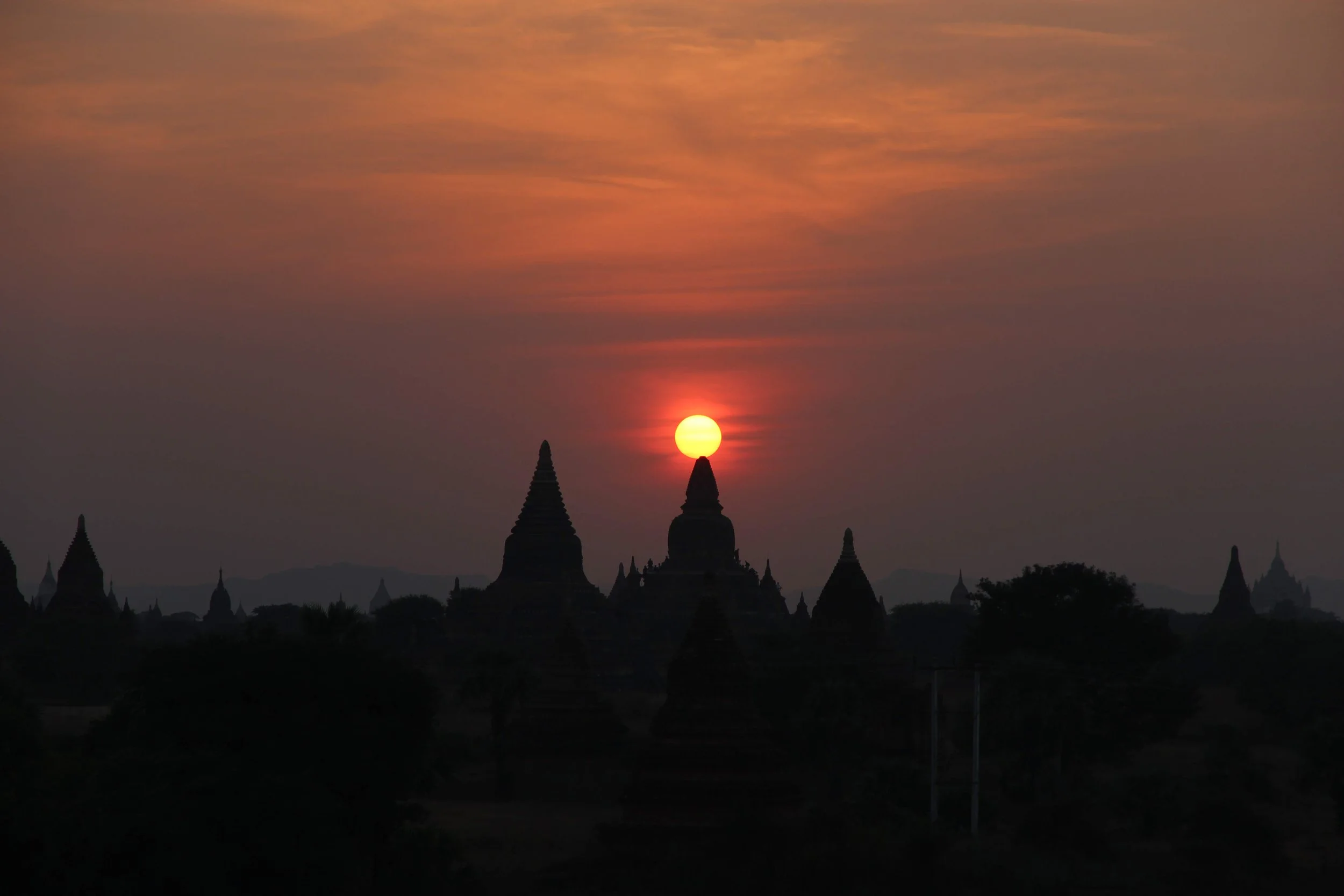 Omdat we nu toch wakker zijn en het nog enkele uren zal duren voordat we kunnen inchecken, kunnen we onze tijd beter nuttig besteden en besluiten we om er meteen in te vliegen en de zonsopgang te gaan bezichtigen op 1 van de vele tempels. Met een busje worden we een beetje verder naar één van de bekende tempels gebracht en na een tijdje zien we de zon aan de horizon verschijnen. Met de komst van het licht wordt ook meer en meer van het prachtige landschap onthuld. We hadden ons geen betere kennismaking met de pracht van Bagan kunnen inbeelden. Beetje bij beetje zie je vanuit de hoogte honderden tempels in de verte verschijnen. Als het nog wat lichter is, stijgen ook vele luchtballonnen op om over de pracht en praal van deze streek te varen. Bagan zou één van de topbestemmingen over de hele wereld zijn om een luchtballonnenvaart te maken. Jammer genoeg ook een heel erg prijzige ervaring waardoor wij hiervoor moeten passen, maar we zijn al erg blij dat we dit schouwspel vanop de grond mogen bewonderen. De rest van de dag besluiten we het rustig aan te doen. We hebben immers nog twee volledige dagen om in Bagan rond te dwalen tussen de tempels.