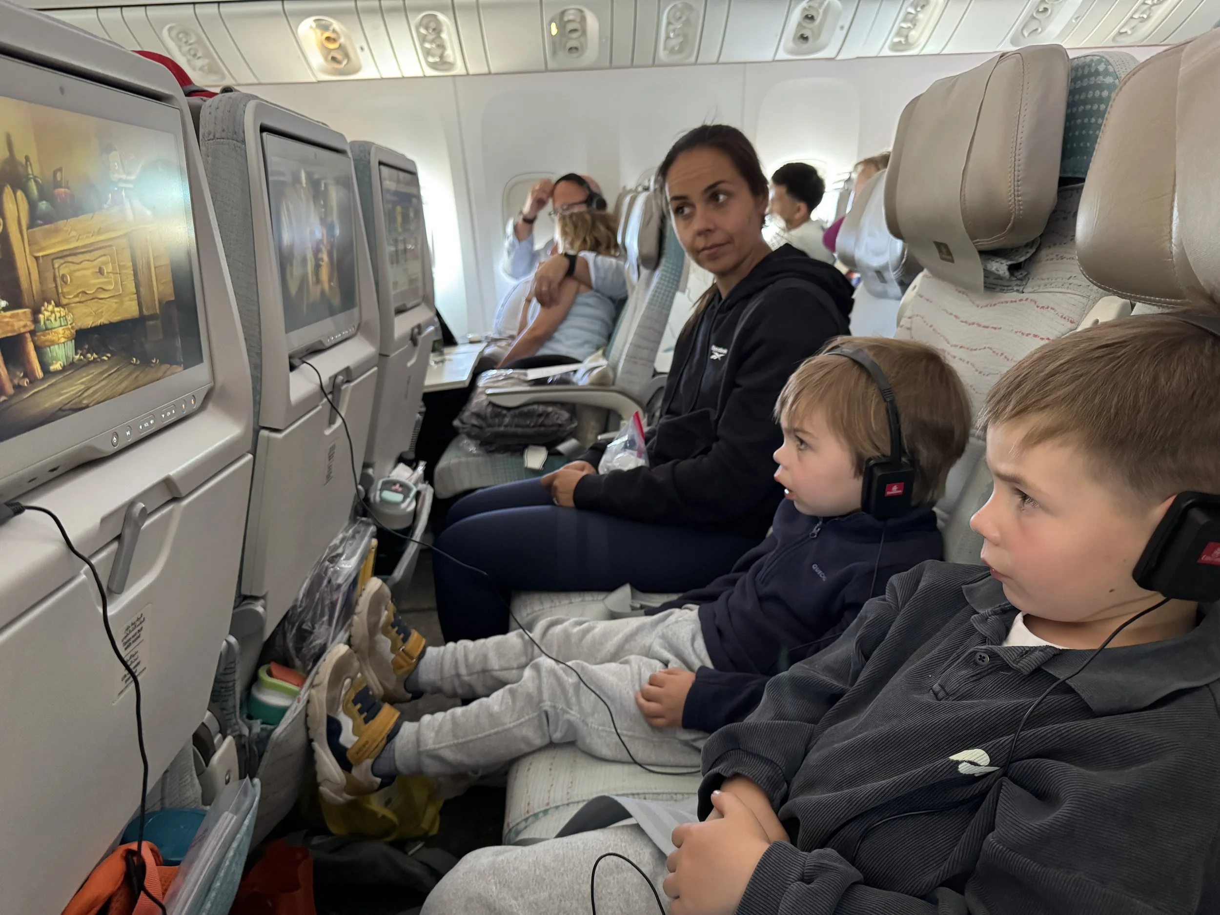 De jongens waren enthousiast, ook zij waren aan het aftellen. Ze hadden elks hun afscheidsfeestje op school, we aten nog een laatste keer Vlaamse boerenkost (worst met bloemkool) en dan op tijd naar bed voor de grote dag. Woensdag 14 augustus, de ochtend van vertrek kregen we nog een laatste vaccinatie bij de dokter en dan konden we vertrekken. Het boarden verliep vlot en de mannekes waren ook heel braaf op de vlucht. Wel totaal niet geslapen, dat beloofde voor later want we landden pas tegen middernacht lokale tijd (22u Belgie). De kapitein van het vliegtuig wist ons te vertellen dat het nog 35 graden was, lekker warm!