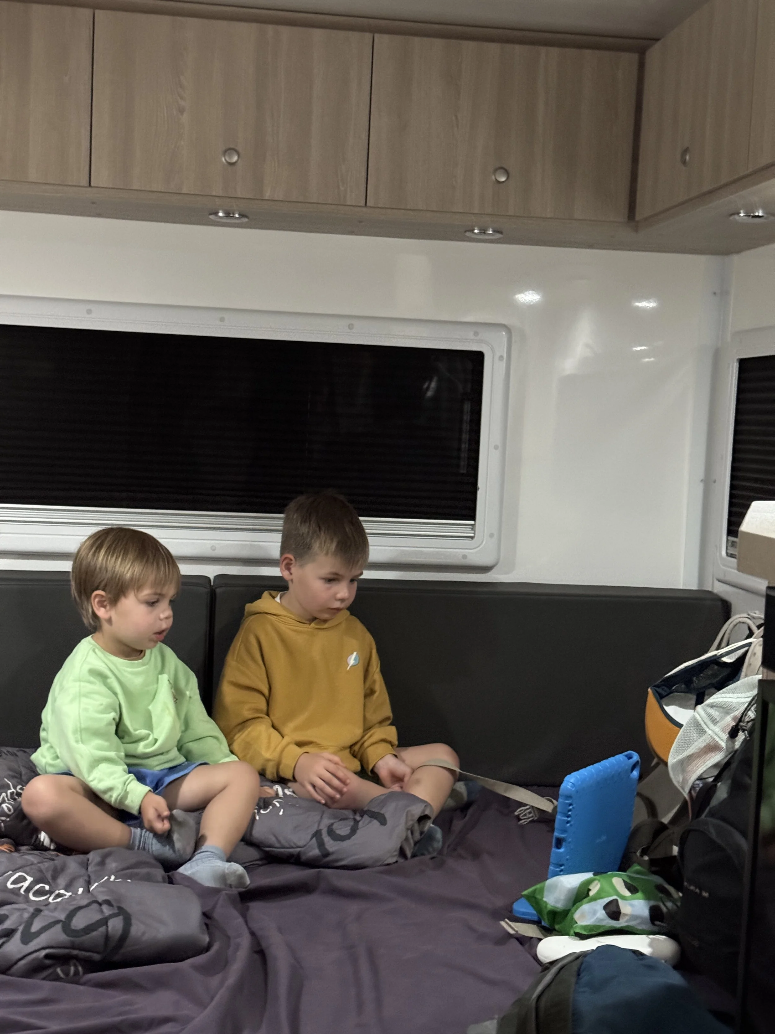 We stoppen aan een winkel en doen de nodige inkopen. Hierna komen we aan bij een eerste overnachtingsplaats. De camping is volzet, maar we mogen ons nog ergens op een grasveld zetten - oef! We merken direct dat het toch beter is om campings op voorhand te boeken en niet zoals onze eerdere camper-reizen waar we dit vaak niet deden. Gelukkig is alles hier goed online geregeld: goede websites, eenvoudig online reserveren en betalen. De kids kijken er naar uit om in de camper te slapen: Leon wil bovenaan en Staf slaapt afwisselend bij Kim of Tom (hij beweegt nogal veel en anders zou hij uit het bedje vallen ;-)).