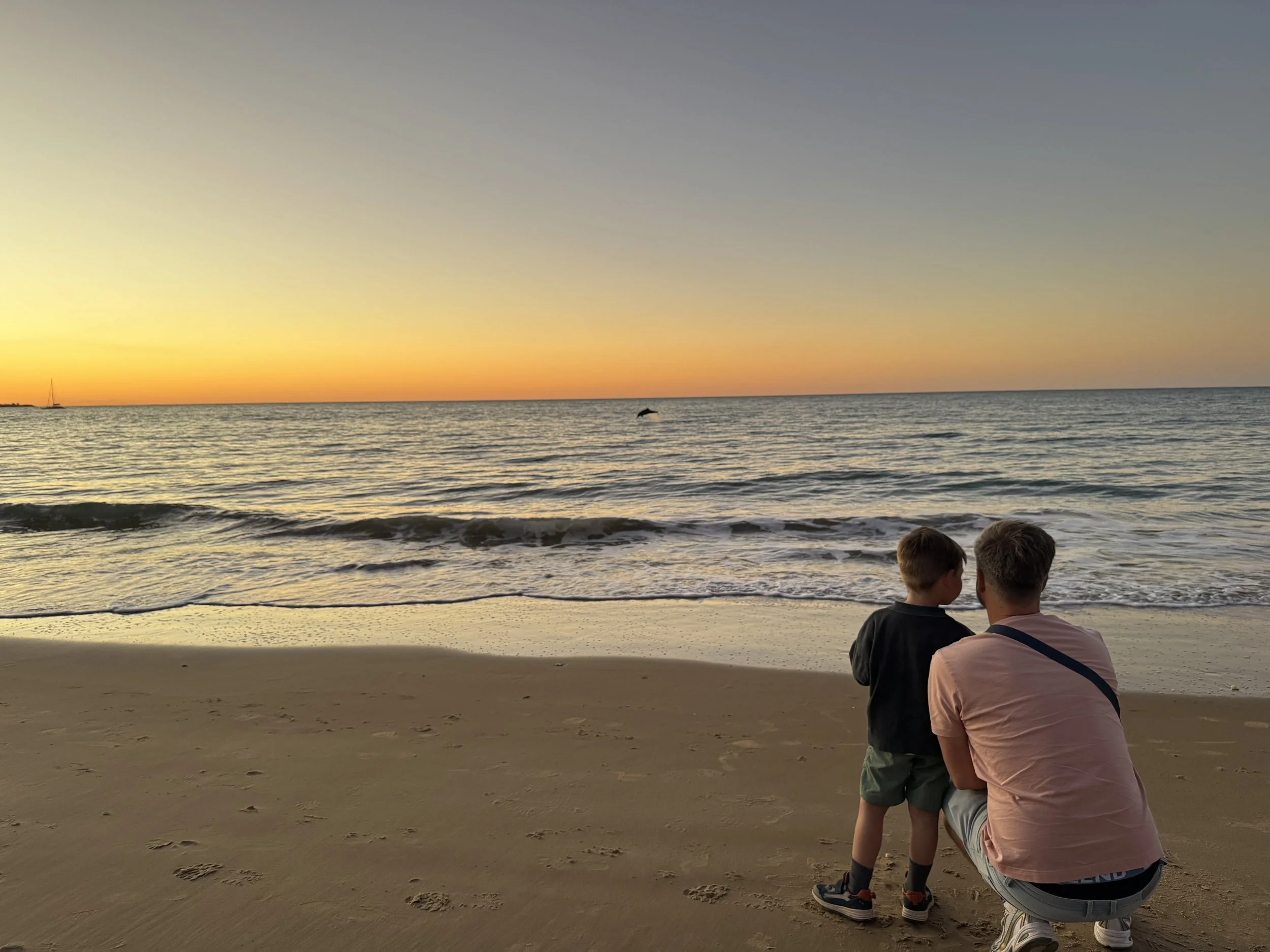 De volgende ochtend gaan we een ‘Brekkie’ eten op de wharf van Marina Bay waar onze cruise vertrok alvorens we doorrijden naar Hervey Bay (2u20min rijden). Daar aangekomen, spotten de boys meteen de Go-Carts. Daar kunnen we niet onderuit. We wandelen die dag nog naar het strand dat vlakbij ligt. In Hervey Bay is niet veel te doen en het lijkt voornamelijk een dorpje waar veel ‘Grey Nomads’ (mensen die op pensioen zijn noemen ze hier de Grey Nomads 😊) naartoe trekken. We zien de zonsondergang op het strand en krijgen er plotseling een hele dolfijnen-show bij! PRACHTIG!