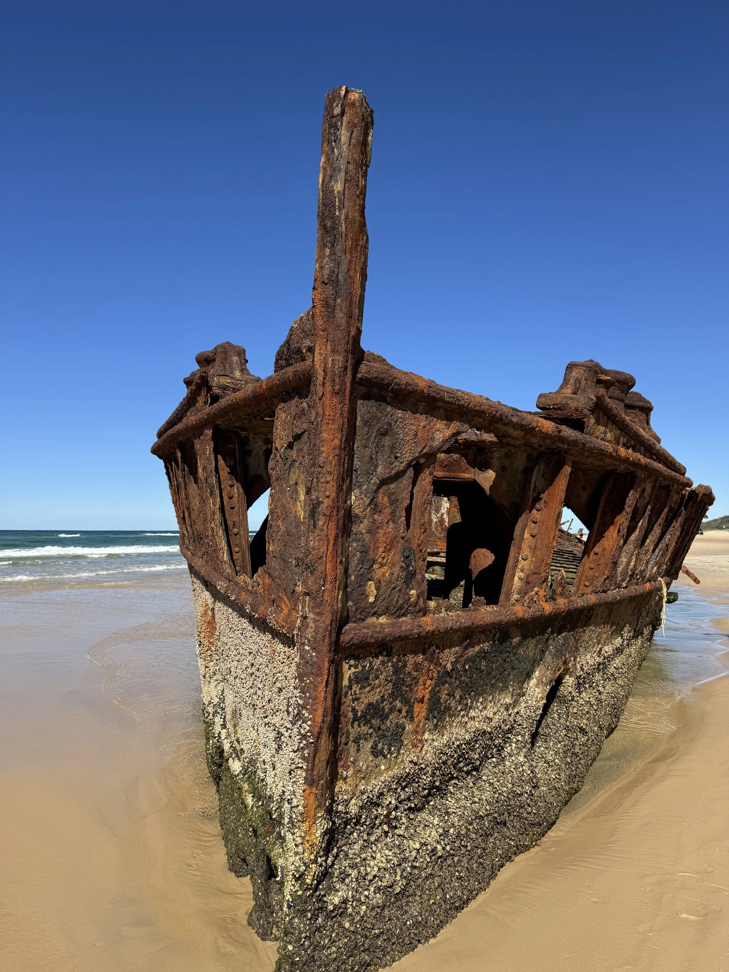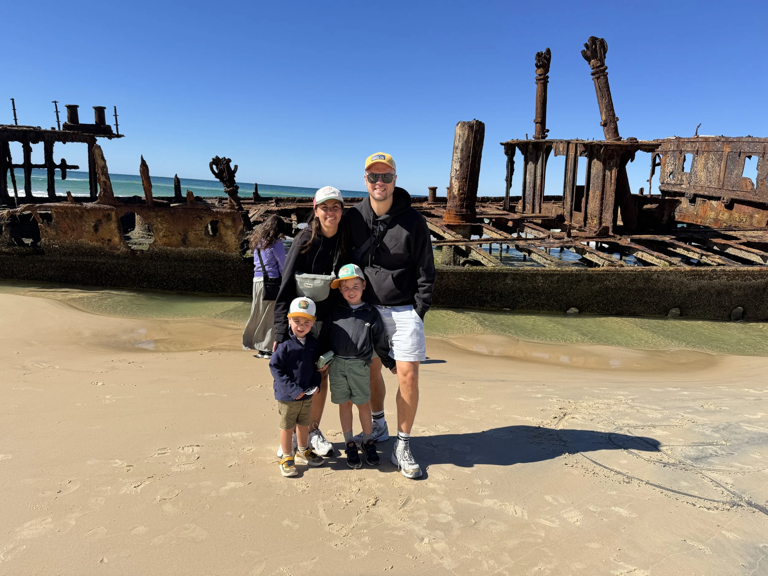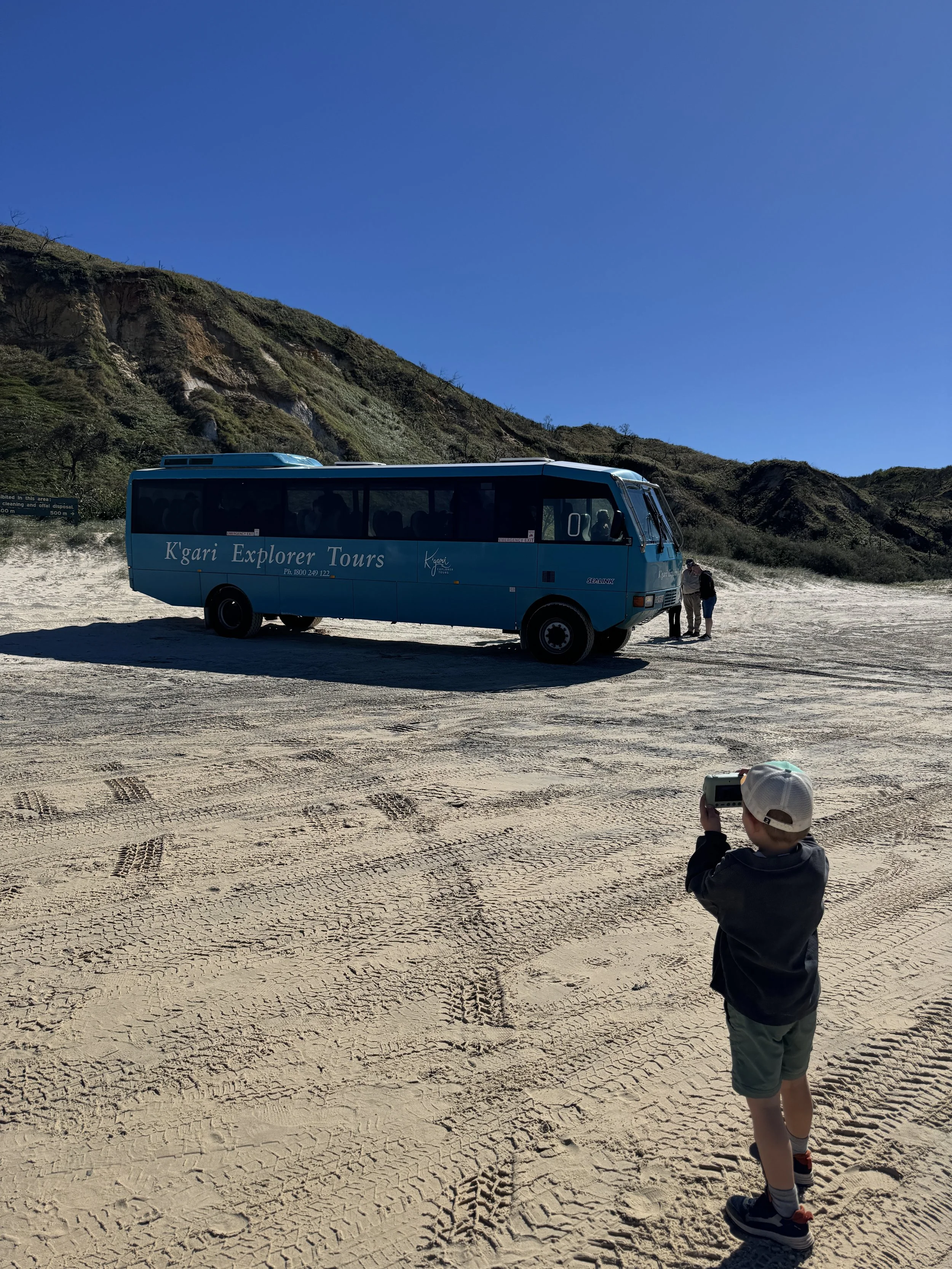 We gaan met een georganiseerde tour naar ‘k Gari (Fraser Island hoe ze het vroeger noemden). Het grootste zand-eiland ter wereld! De bus brengt ons bij de baai waar een ferry vertrekt naar het eiland. Aangezien er op dit eiland enkel zandwegen zijn is ons vervoermiddel van de dag een 4x4 bus, wat Leon en Staf uiteraard weer geweldig vinden! In eerste instantie geen kinderzitjes aanwezig, maar gelukkig komt de buschauffeur even later toch met een zitje, wat wel echt nodig lijkt gezien de bumpy ride! Stafke valt meteen in een diepe slaap en na een uurtje rijden dwars door het eiland, met interessante informatie over het eiland, stoppen we aan het begin van 75 Mile Beach. Een lange strook zand langs het water waar veel 4x4’s en bussen tegen hoge snelheid rijden, precies een autostrade. We zien onderweg Dingo’s (wilde honden, gevaarlijk voor kleine kinderen en ze waarschuwen ons om Staf en Leon dicht bij ons te houden) en ook nog een Humpback Whale. Verdere stops zijn een oud scheepswrak dat hier gestrand ligt en een kleine ‘creek’ waar we met onze voeten door kunnen waden. Een van de hoogtepunten voor Leon! Voor we terugkeren stoppen we nog aan een groot meer waar de kids en Tom nog een klein (fris) zwemmeke doen. We genieten van de natuur, en de trip en voor we het weten is de dag weer gepasseerd. Time flies!