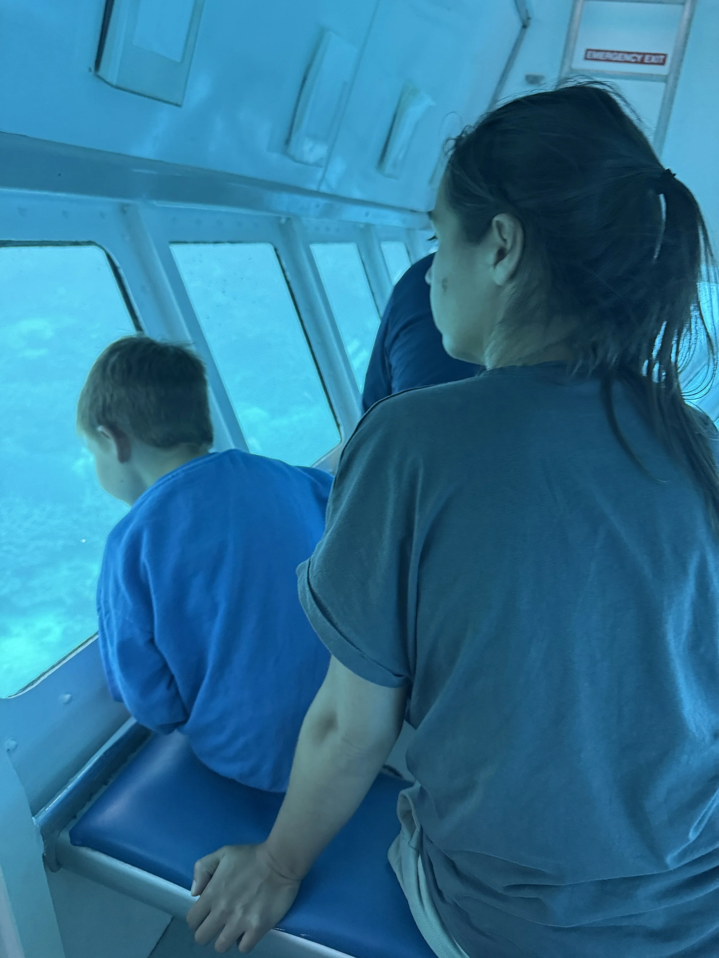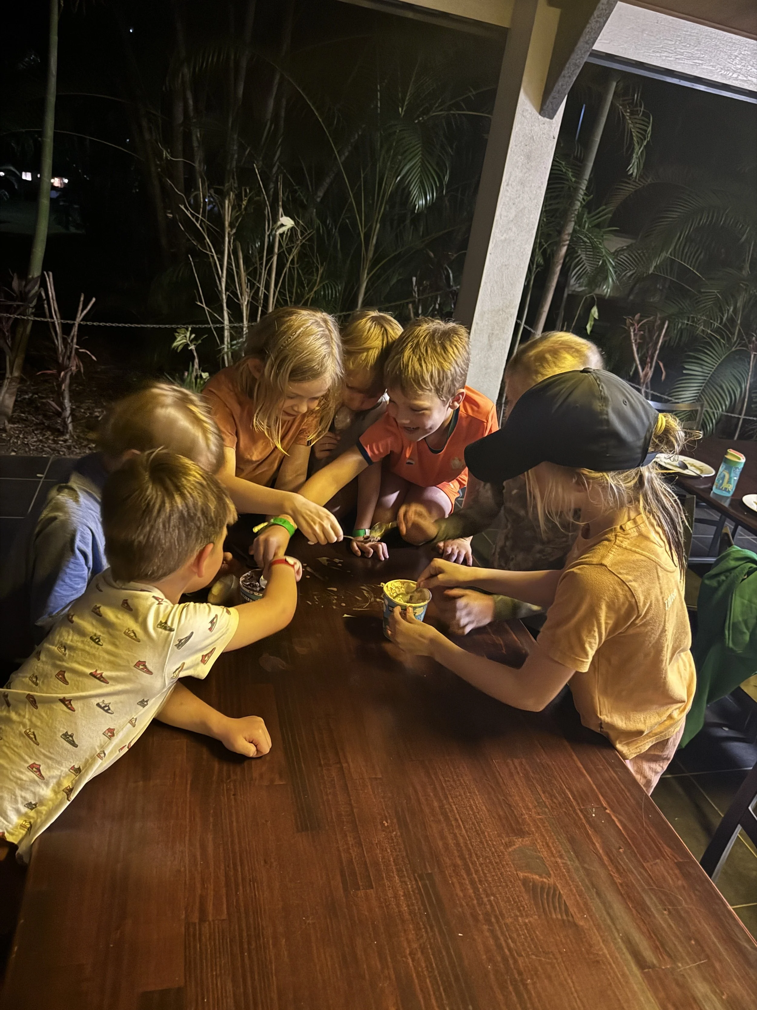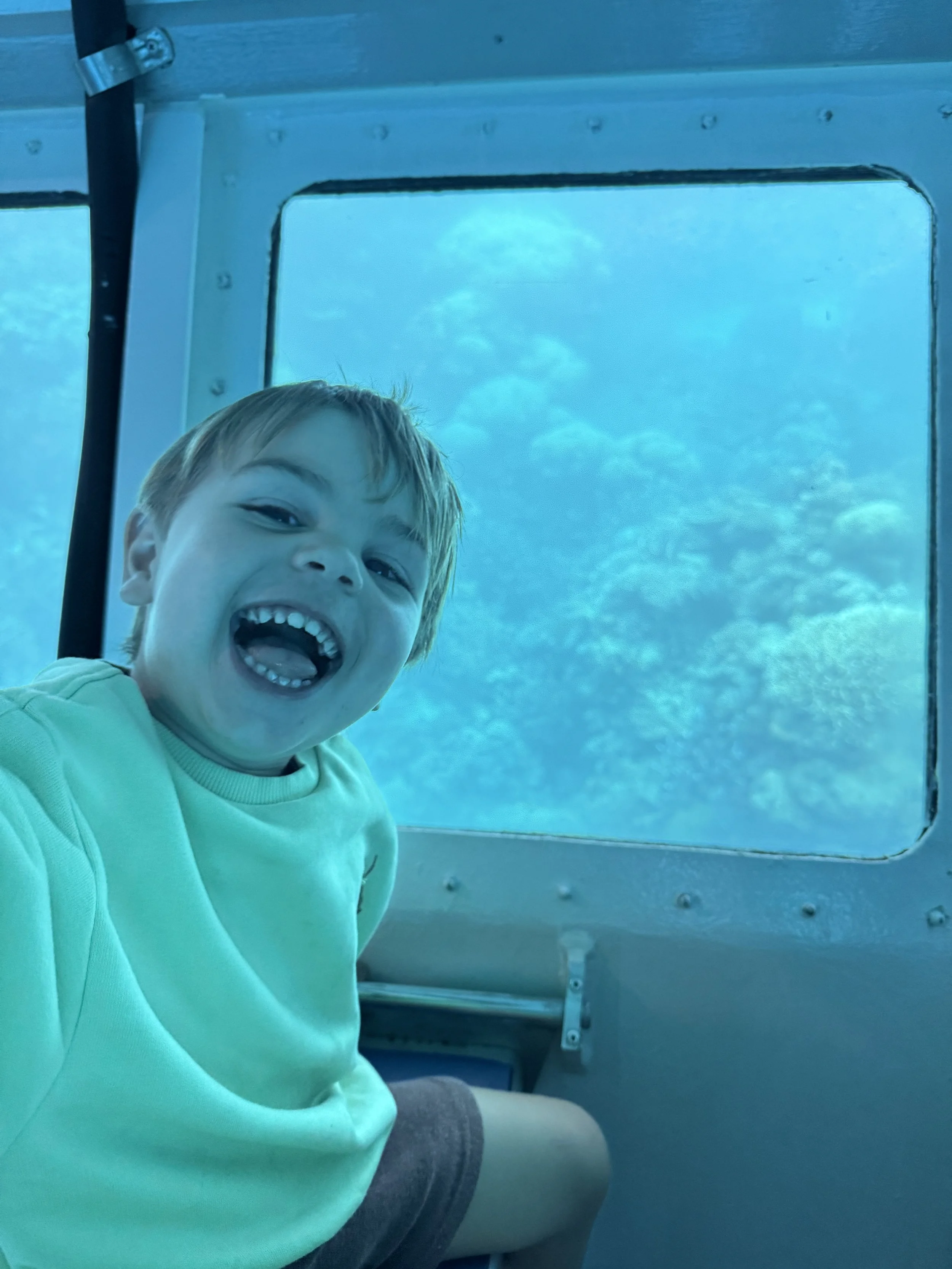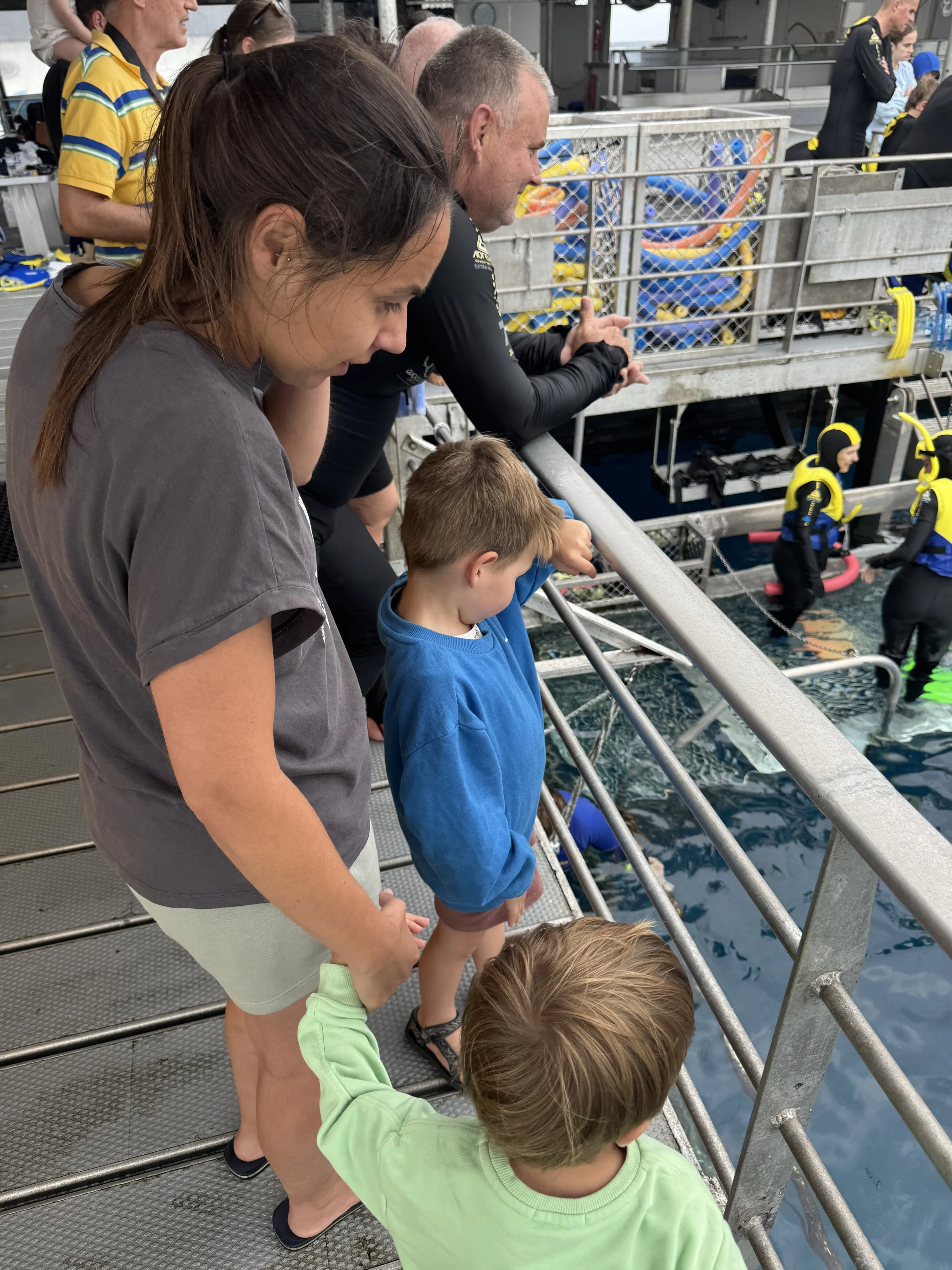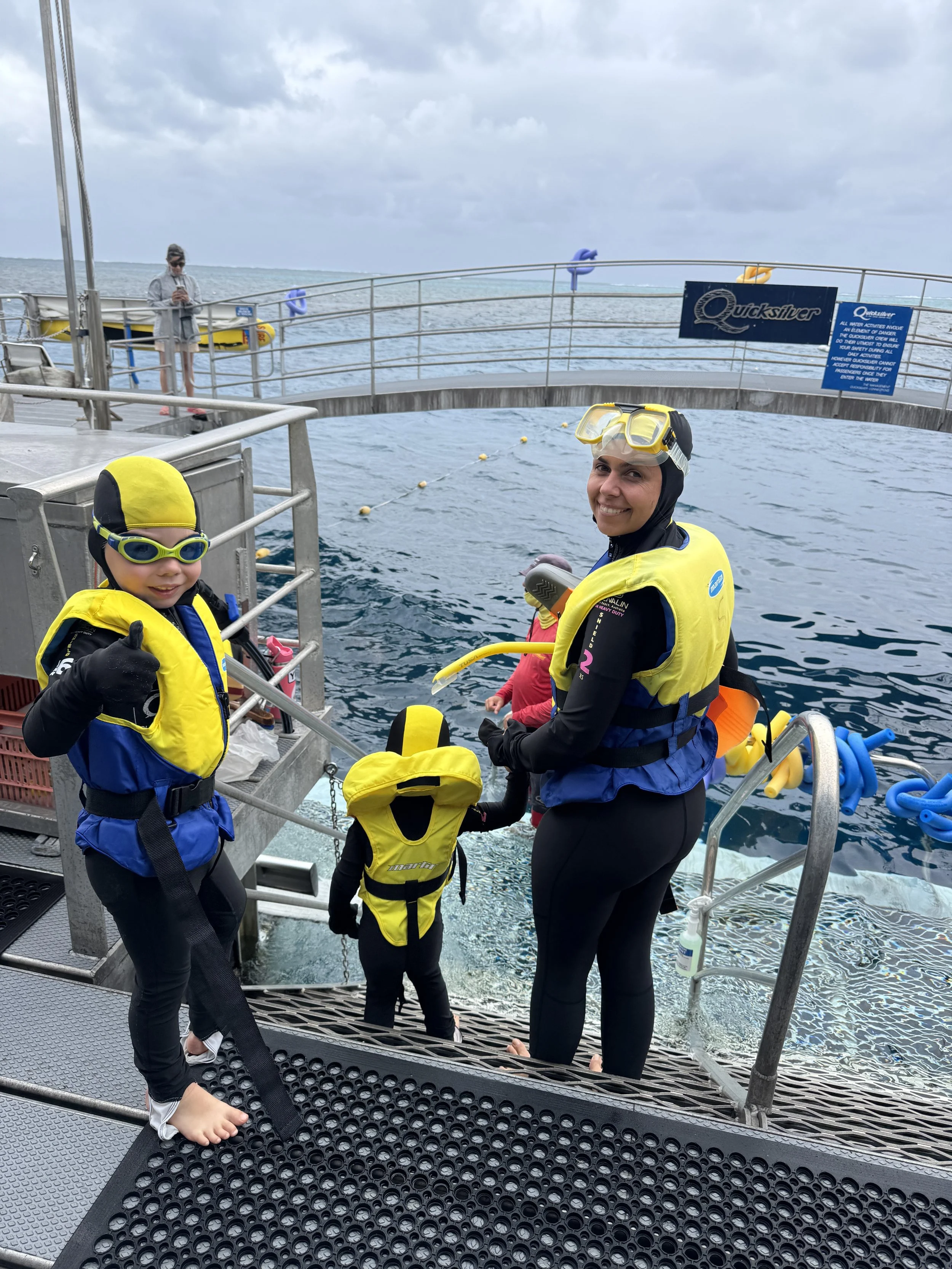 De volgende dag start vroeg, we gaan met z’n viertjes naar een ponton op het great barrier reef waar we kunnen duiken, snorkelen,… en waar er activiteiten zijn die ook de kids mee kunnen doen zoals mee varen met een onderwaterboot. Eerst een kort ritje naar de haven, en daarna een tweetal uur met de boot. Ze waarschuwen weer voor een hevige oceaan en nemen onze pilletjes tegen zeeziekte. Uiteindelijk valt het allemaal wel mee (zeker niet zo erg als bij de Whitsundays!) Bij aankomst gaat Tom onmiddellijk mee op duikexcursie en Kim en de jongens staan klaar om mee te varen met de onderwaterboot die een tochtje maakt van 15 minuten door het rif. We krijgen ook lunch op de boot en de tijd vliegt voorbij. De kids vinden de onderwaterboot zo fijn dat we een 2de keer gaan, en daarna trekken we met vieren ons zwempak aan om samen te gaan zwemmen/snorkelen. De kids stelen de show in hun zwempakjes, ongetwijfeld het schattigste duo van heel de great barrier reef. Tom en Leon zitten nog in het water en we horen de hoorn van de boot waarmee wordt aangegeven dat het weeral tijd is om te vertrekken. De dag is echt voorbij gevlogen, en hij is nog niet gedaan. Op de camping hebben we afgesproken om met Ben & Linda, en nog twee andere Nederlandse gezinnen te bbq’en. Het is echt een topavond geworden waar we: leren dat een BBQ zonder pindasaus een NO GO is voor elke Nederlander, proeven dat kangoeroevlees best wel lekker is en zien dat kids niet veel meer nodig hebben dan een grote pot ijs en ieders een lepeltje om de tijd van hun leven te hebben. Een avond om niet te vergeten!