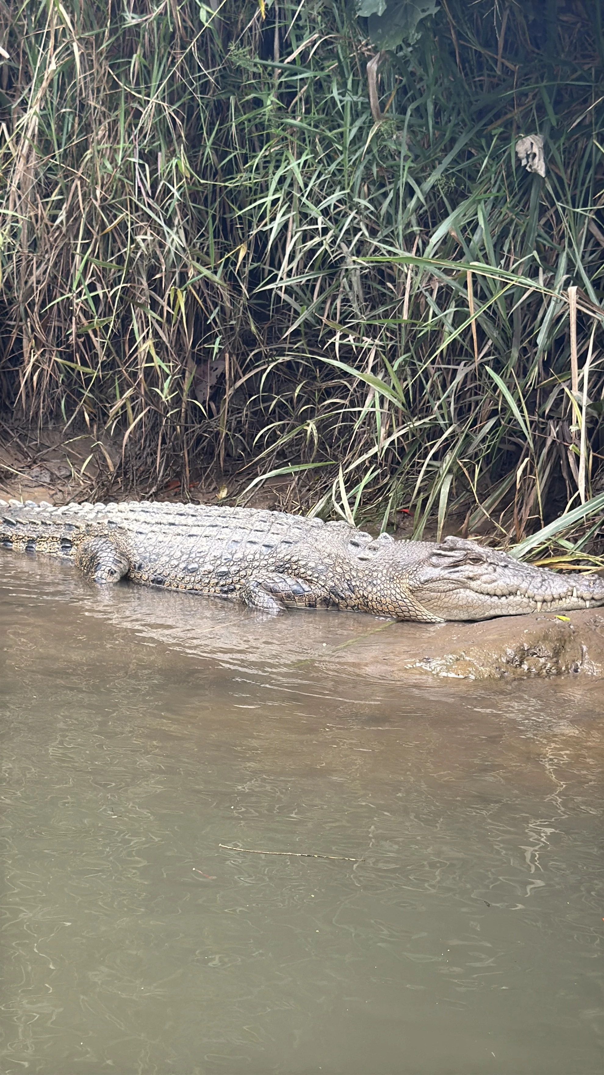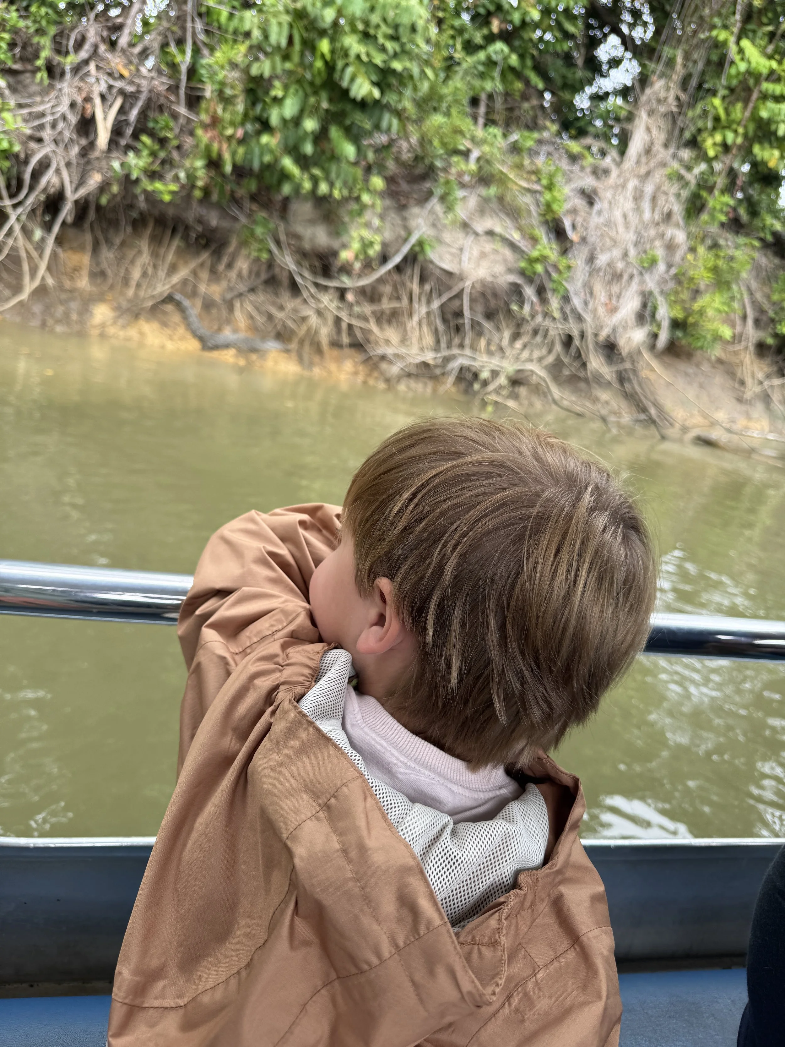 Op naar ons Noordelijkste punt, Cape Tribulation of Cape Trib zoals de locals het noemen. Na een uurtje rijden naderen we de Daintree River en hier moeten we een overzetboot nemen om de rivier over te steken. Voor we dat doen beslissen we om een boottochtje te maken om krokodillen te spotten, een ideale tussenstop! Kids zijn enthousiast maar Kim vertrouwt het toch niet helemaal. De gids waarschuwt ons ook meerdere malen dat deze krokodillen levensgevaarlijk zijn en je je daarom in deze regio nooit in het water mag begeven.