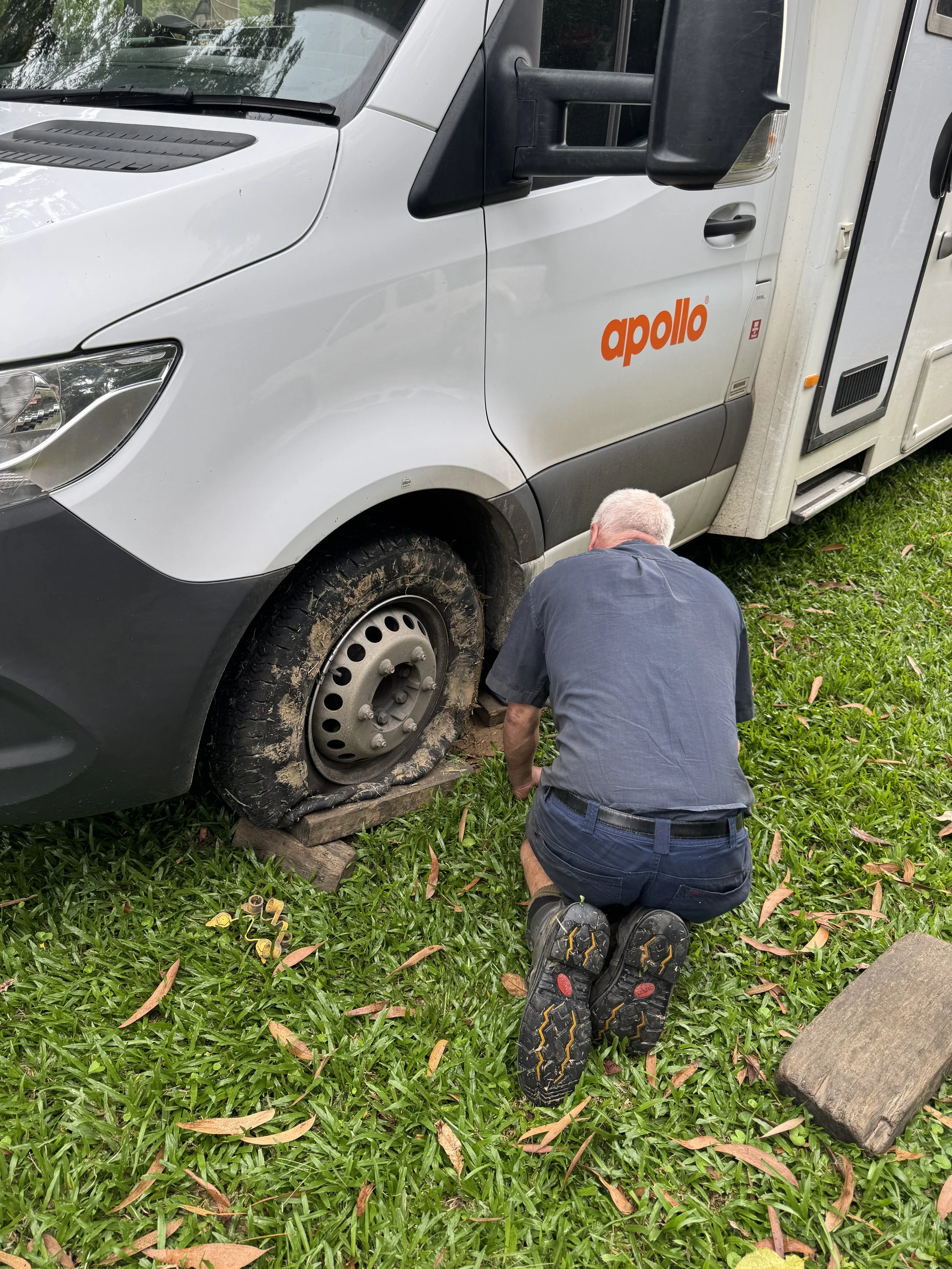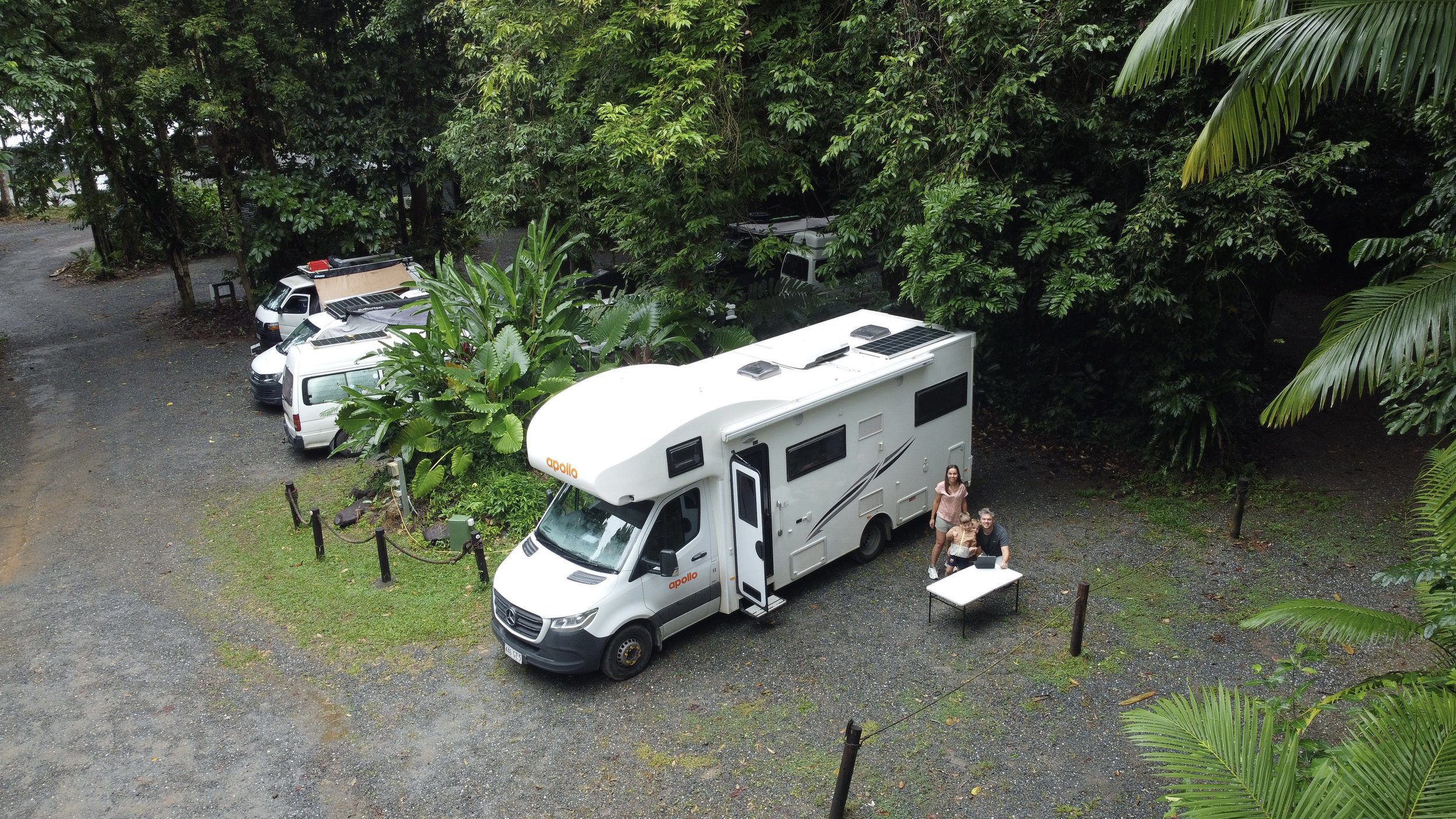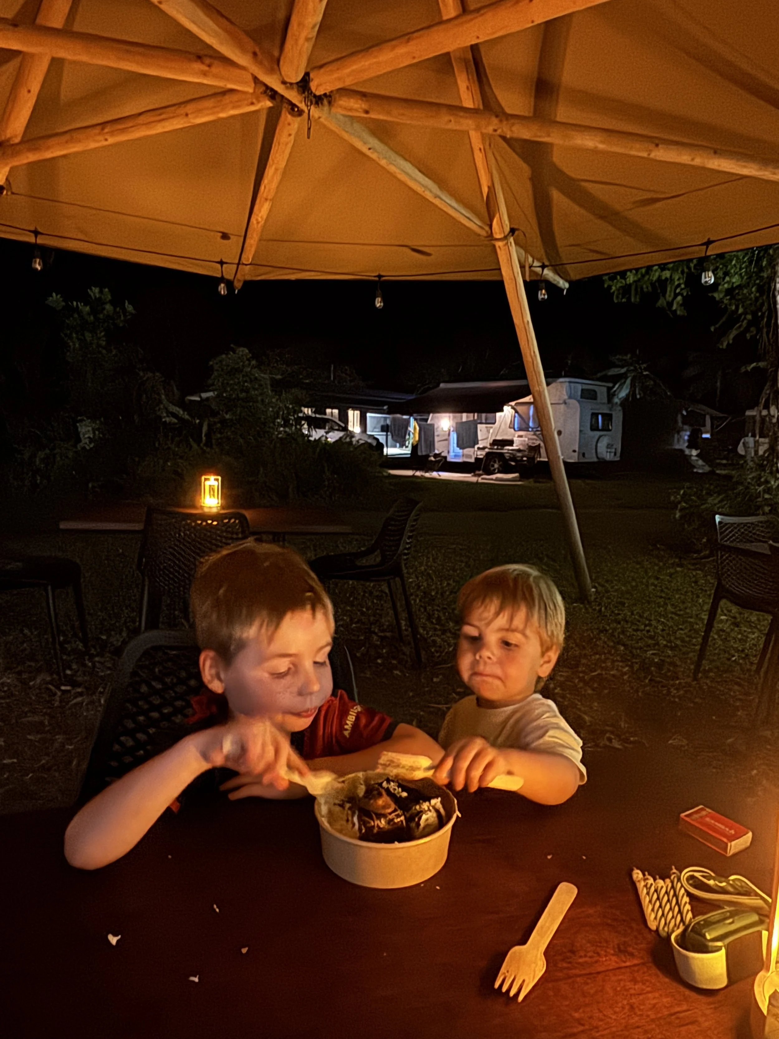 Nog voordat we Cape Trib uitgereden zijn krijgen we een platte band. Daar staan we dan, ergens te midden van het regenwoud aan de kant van de weg. Gelukkig niet te ver weg van de ijsjesshop waar we enkele uurtjes kunnen wachten (filmpjes en ijsjes voor de kids 😊. Na een viertal (!) uren komt de pechverhelping ter plaatse. Nog een halfuurtje later is onze band vervangen en kunnen we eindelijk onze toch verder zetten. We maken er het beste van en we beloven Leon nog een pannenkoekenfeestje op de camping, maar ook dat verloopt niet zoals gepland. Bij het parkeren van de camper raken we een laaghangende tak van de boom waardoor er een wespennest goed door elkaar wordt geschud. Dit hadden we pas door toen Tom en Leon bij het uitstappen werden aangevallen. Volop paniek en chaos. Kim en Staf liepen wat achter dus hadden niet door wat er aan de hand was. Uiteindelijk zijn er zelfs wespen mee in de camper gevlogen waardoor Staf ook nog een wespensteek heeft gekregen. Als kers op de taart: mislukte pannenkoeken en geen deftige campingkeuken. Wat een dag, zoiets kan je zelf niet verzinnen. Godzijdank waren er wel food trucks op de camping waar we fish & chips en chocoladetaart hebben besteld. Toch nog een goede afsluiter van een absolute pechdag. Arme Leon, hij had zijn feestdag natuurlijk helemaal anders voorgesteld. Laten we hopen dat hij vooral de chocoladetaart onthoudt en we beloven dat we morgen opnieuw een feestje doen en hij morgen alles mag kiezen wat we doen!