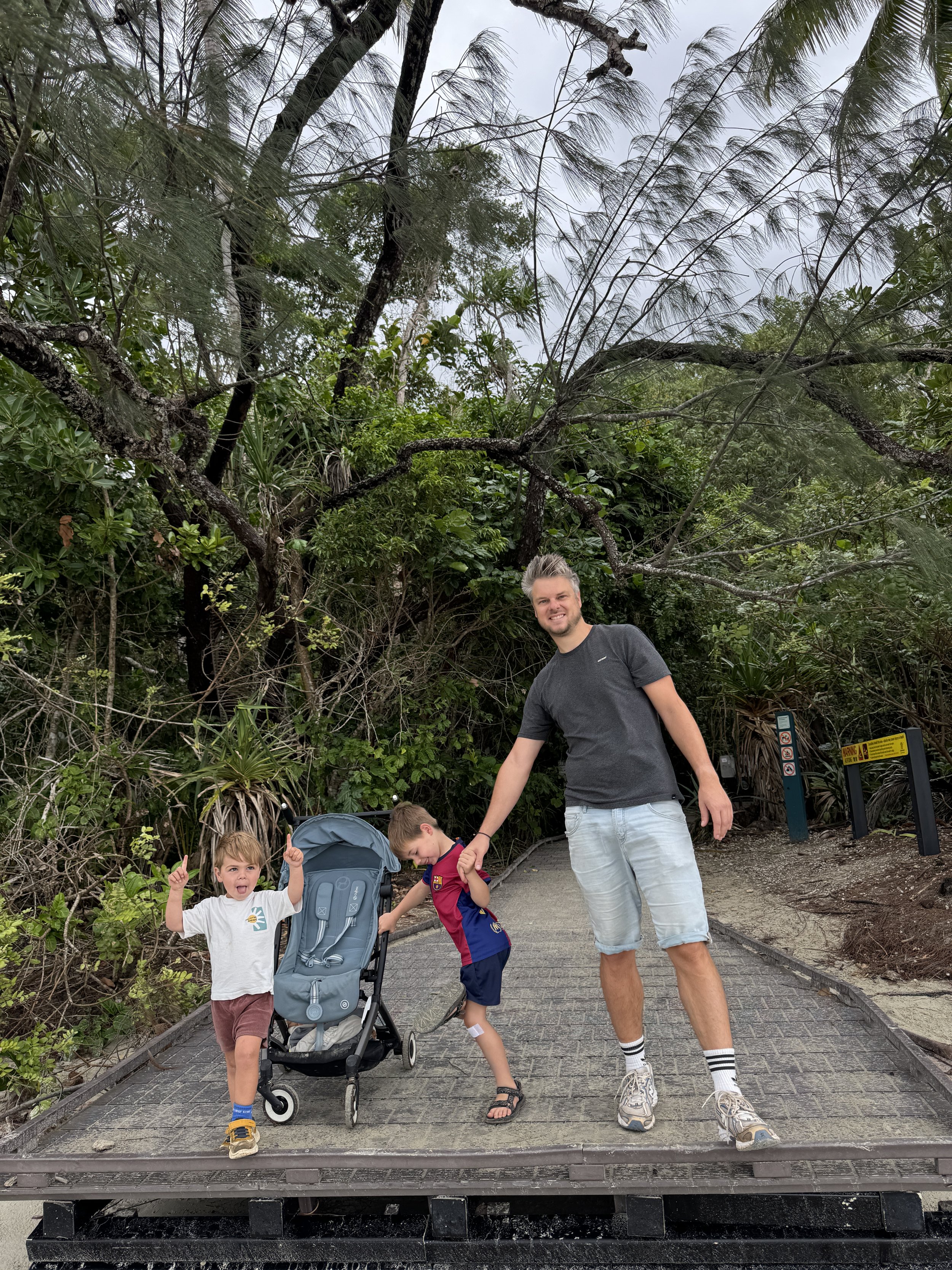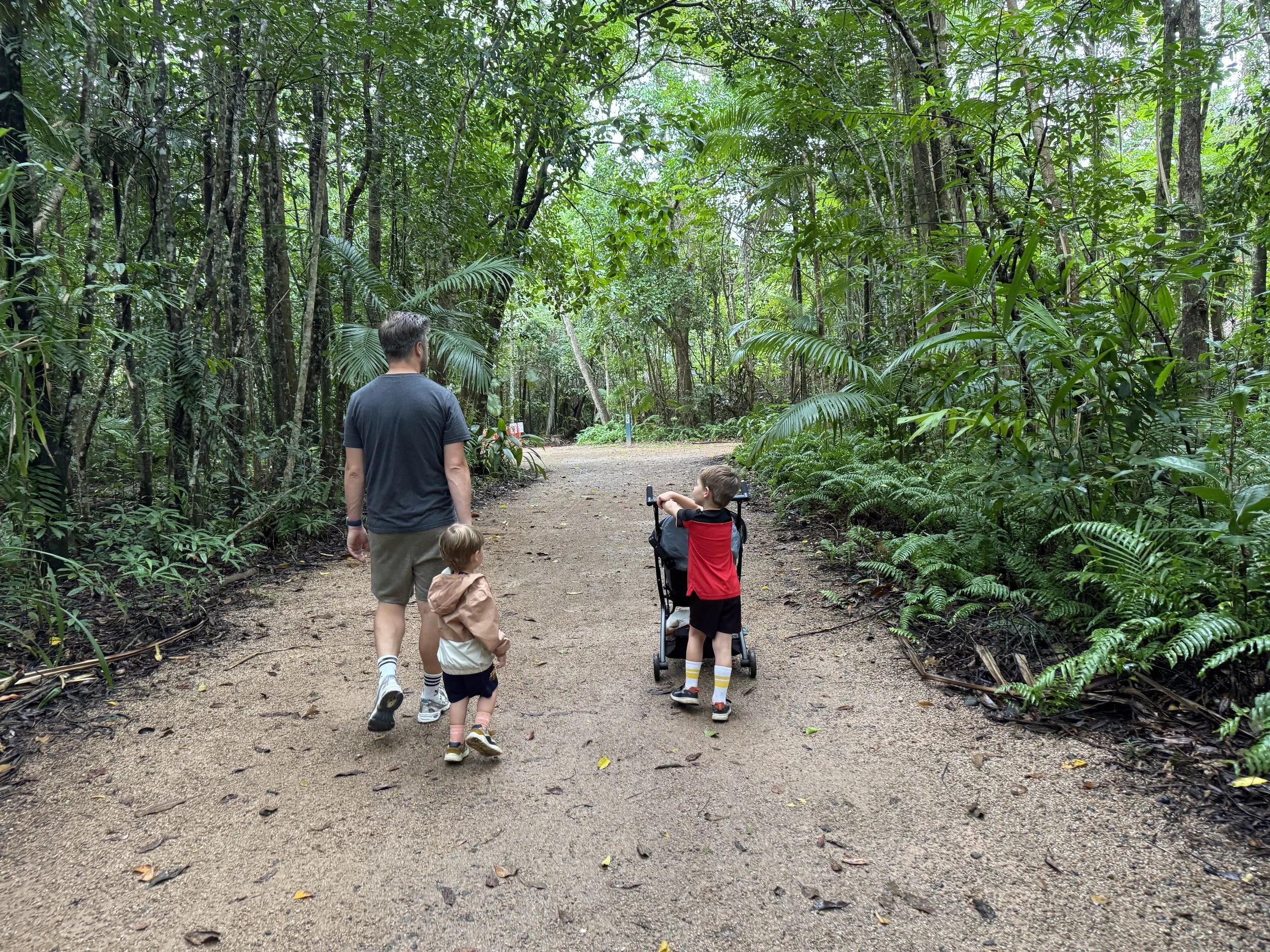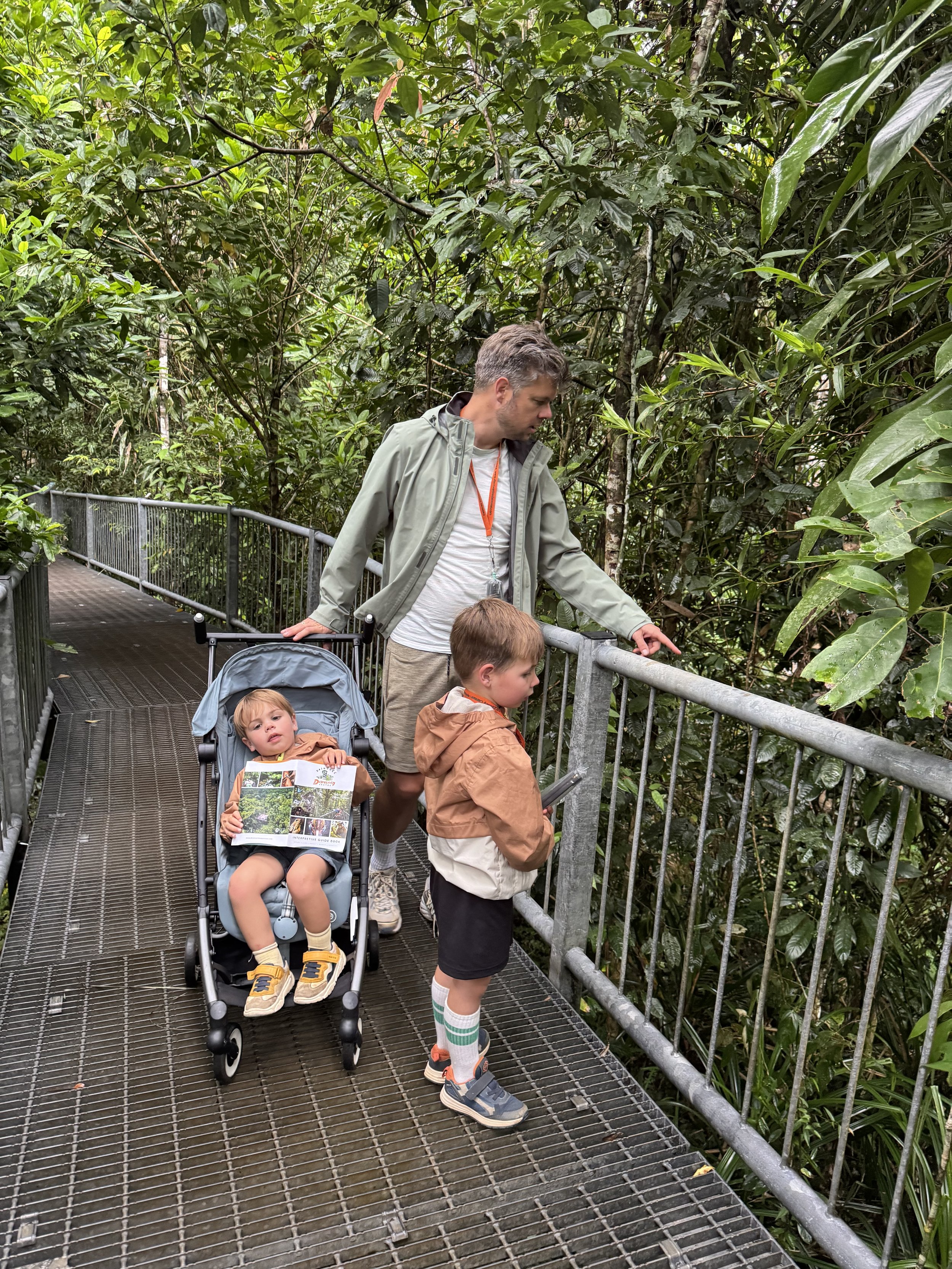 De volgende dag gaan we de omgeving verder exploreren. We hebben 3 wandelingen op het programma, allemaal boardwalks door de jungle. De eerste ligt op wandelafstand en het handige is dat alles met buggy toegankelijk is. Herhaaldelijk geven we de jongens de twee regels van het regenwoud mee: regel 1 Blijf op het wandelpaadje en regel 2 Niets aanraken. De eerste wandeling blijkt de beste van de 3 te zijn en een bordje waarop vermeld staat dat hier de afgelopen week nog een krokodil gespot maakt het allemaal toch ook wat spannender. In de late namiddag gaan we een ijsje eten met de kids bij de lokale ijsjesboer die allerlei tropische smaakjes verkoopt. Vooral de Black Sapote komt naar voren als winnaar. Al snel is het tijd om terug naar onze camping te rijden. Onderweg zien we in de verte een Cassowary de weg oversteken (denken we want het was wel echt ver weg). Onze laatste nacht in het regenwoud en dan gaan we terug richting Cairns. We plannen wel nog een tussenstop zodat we niet te lang moeten rijden. Het is de laatste officiële schooldag en we willen er een echte feestdag van maken voor Leon omdat hij vanaf nu geen kleuter meer is. De dag verloopt alleen helemaal anders dan gepland.