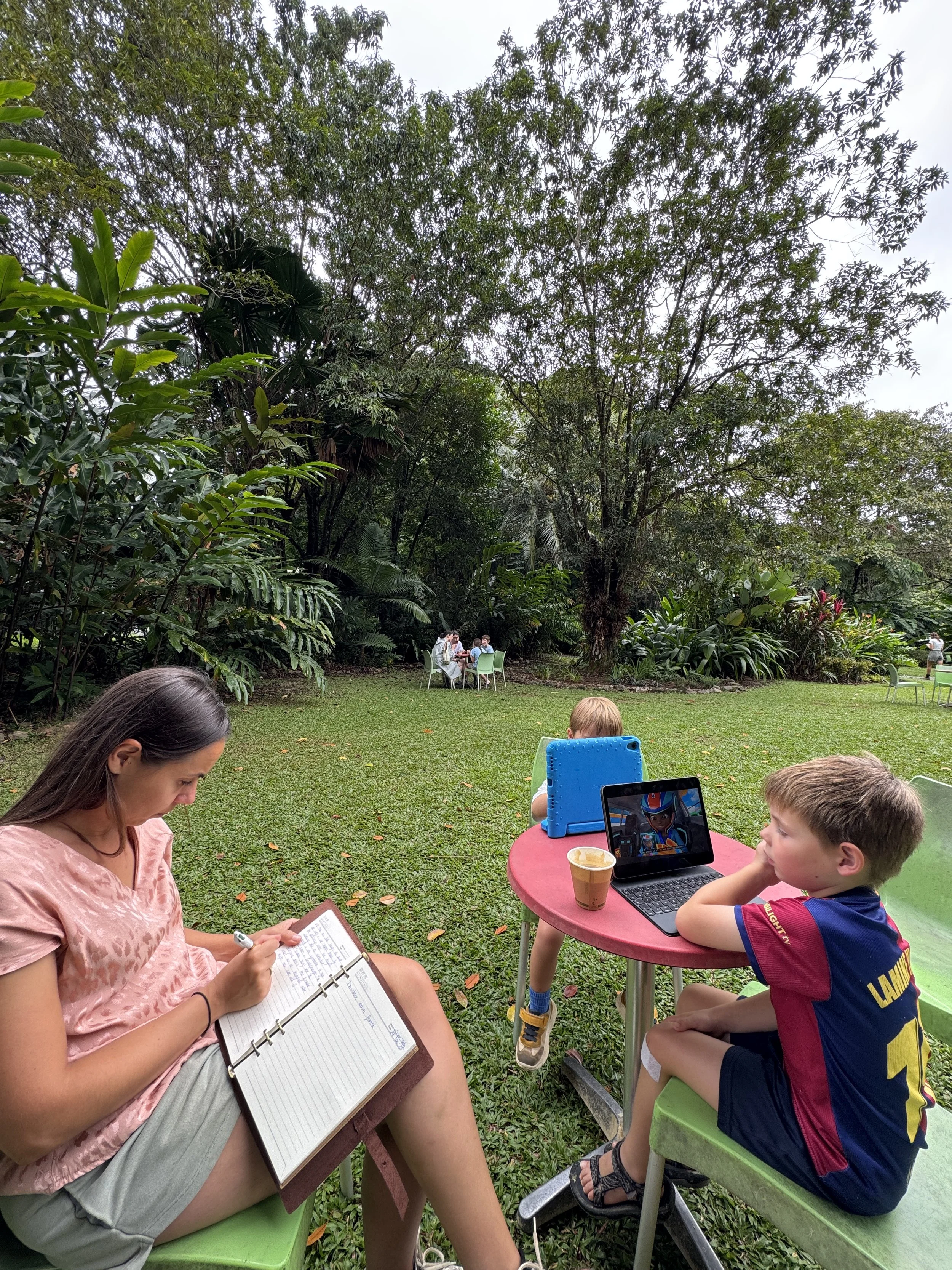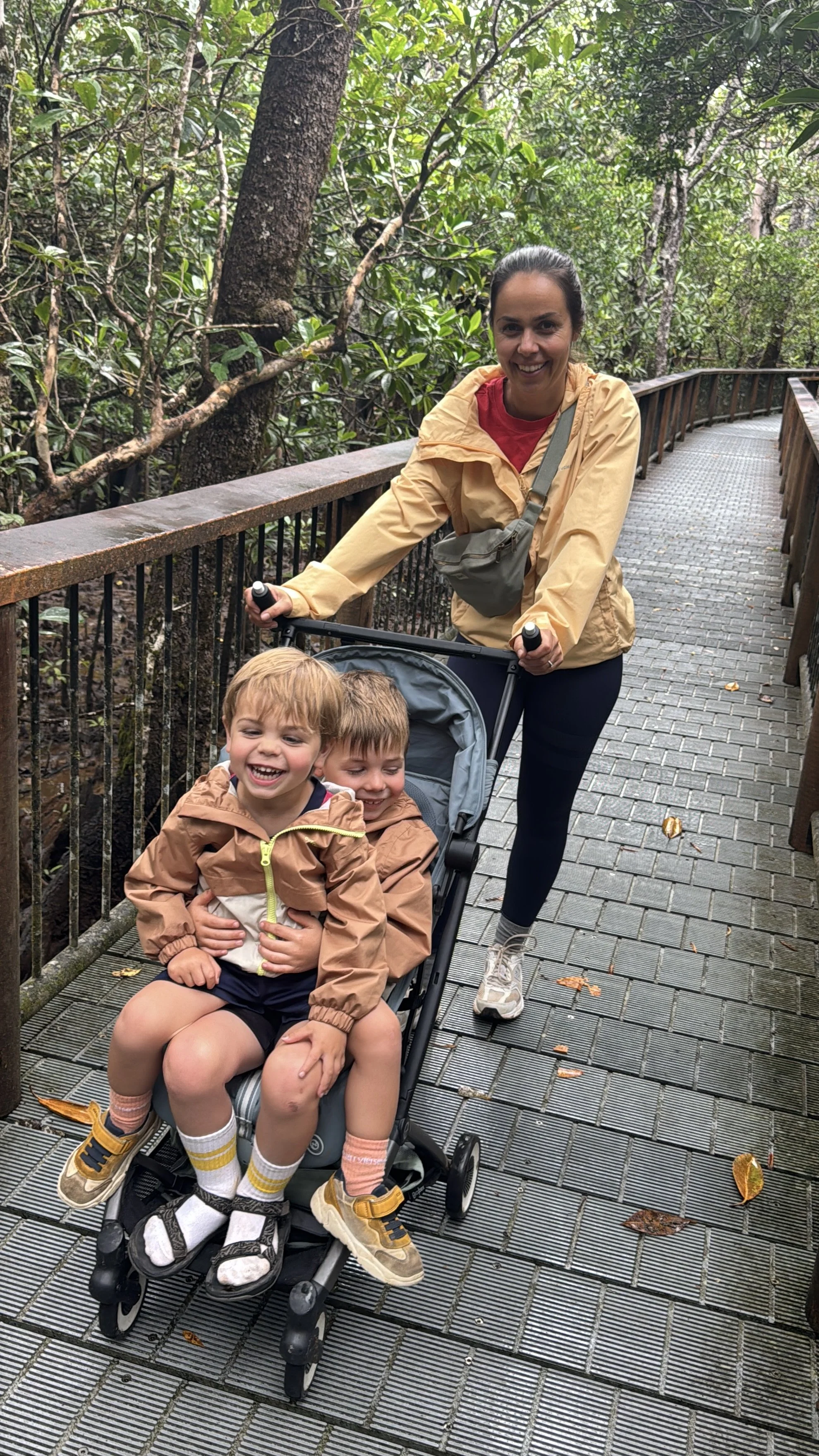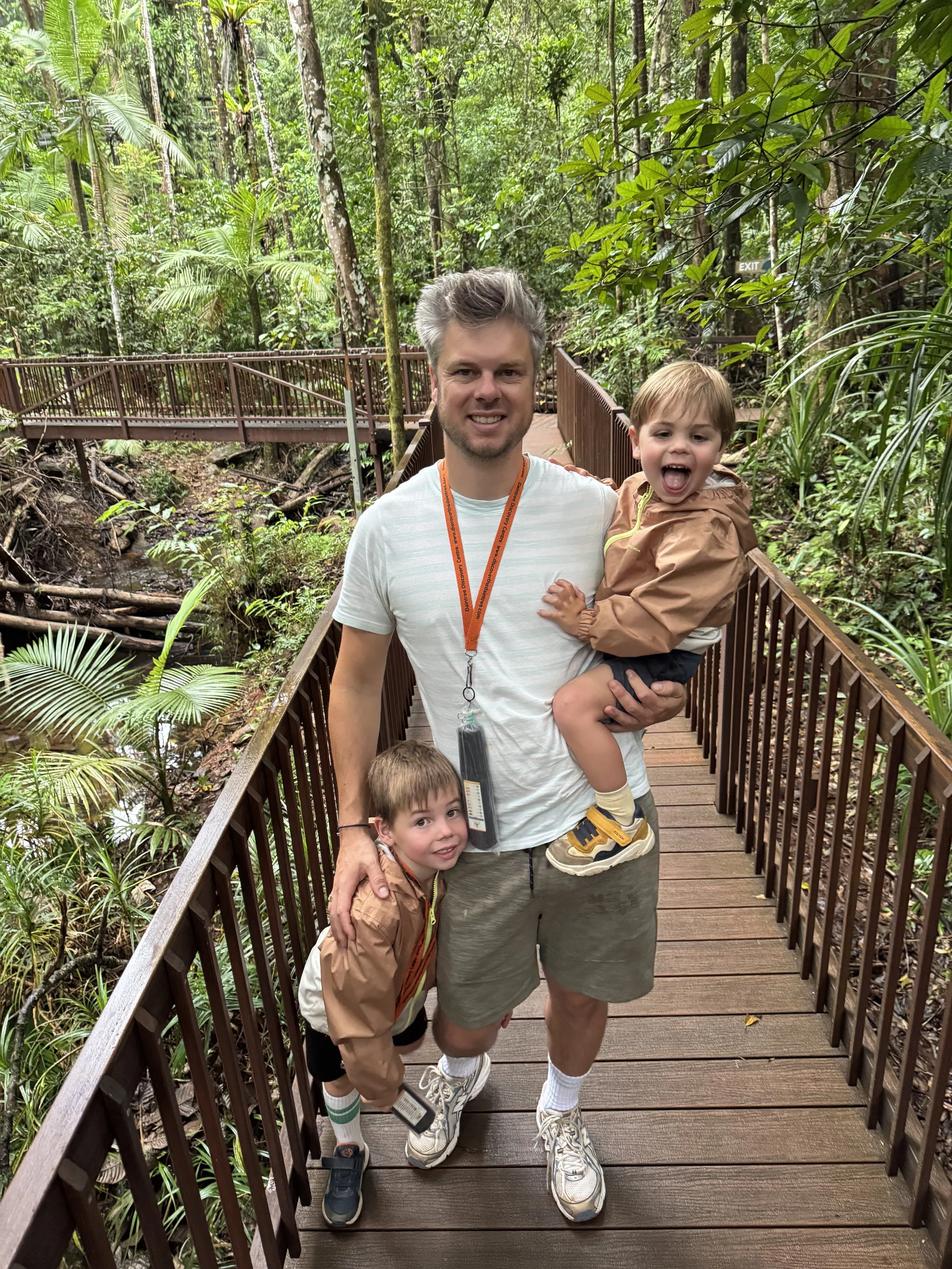De volgende dag gaan we de omgeving verder exploreren. We hebben 3 wandelingen op het programma, allemaal boardwalks door de jungle. De eerste ligt op wandelafstand en het handige is dat alles met buggy toegankelijk is. Herhaaldelijk geven we de jongens de twee regels van het regenwoud mee: regel 1 Blijf op het wandelpaadje en regel 2 Niets aanraken. De eerste wandeling blijkt de beste van de 3 te zijn en een bordje waarop vermeld staat dat hier de afgelopen week nog een krokodil gespot maakt het allemaal toch ook wat spannender. In de late namiddag gaan we een ijsje eten met de kids bij de lokale ijsjesboer die allerlei tropische smaakjes verkoopt. Vooral de Black Sapote komt naar voren als winnaar. Al snel is het tijd om terug naar onze camping te rijden. Onderweg zien we in de verte een Cassowary de weg oversteken (denken we want het was wel echt ver weg). Onze laatste nacht in het regenwoud en dan gaan we terug richting Cairns. We plannen wel nog een tussenstop zodat we niet te lang moeten rijden. Het is de laatste officiële schooldag en we willen er een echte feestdag van maken voor Leon omdat hij vanaf nu geen kleuter meer is. De dag verloopt alleen helemaal anders dan gepland.