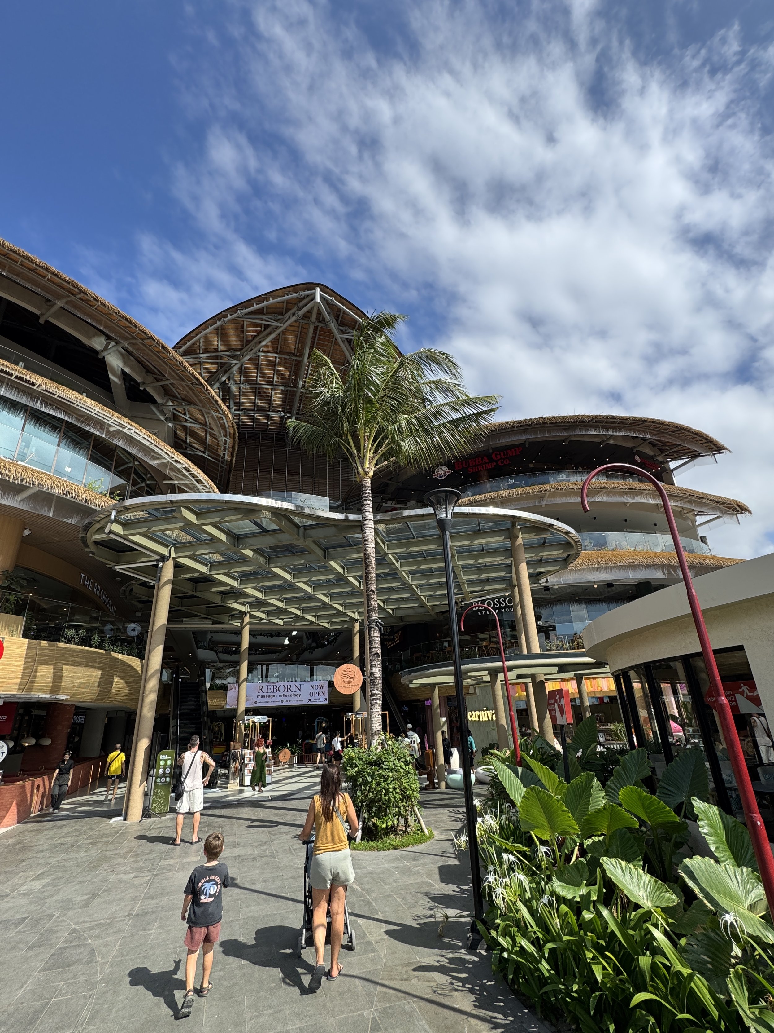 Sanur staat bekend als familiebestemming en een van de enige plaatsen op Bali met een deftige wandelboulevard. Hier kunnen we dus wandelingetjes maken met de buggy. Nu ja, het is pompheet en vochtig, dus veel zweten, water drinken en pauzes nemen! Stafke is doodop (toch kleine jetlag?) en valt snel in slaap in de buggy. We verschieten van de mega fancy barretjes en restaurants, en zelfs een giga shopping center.
