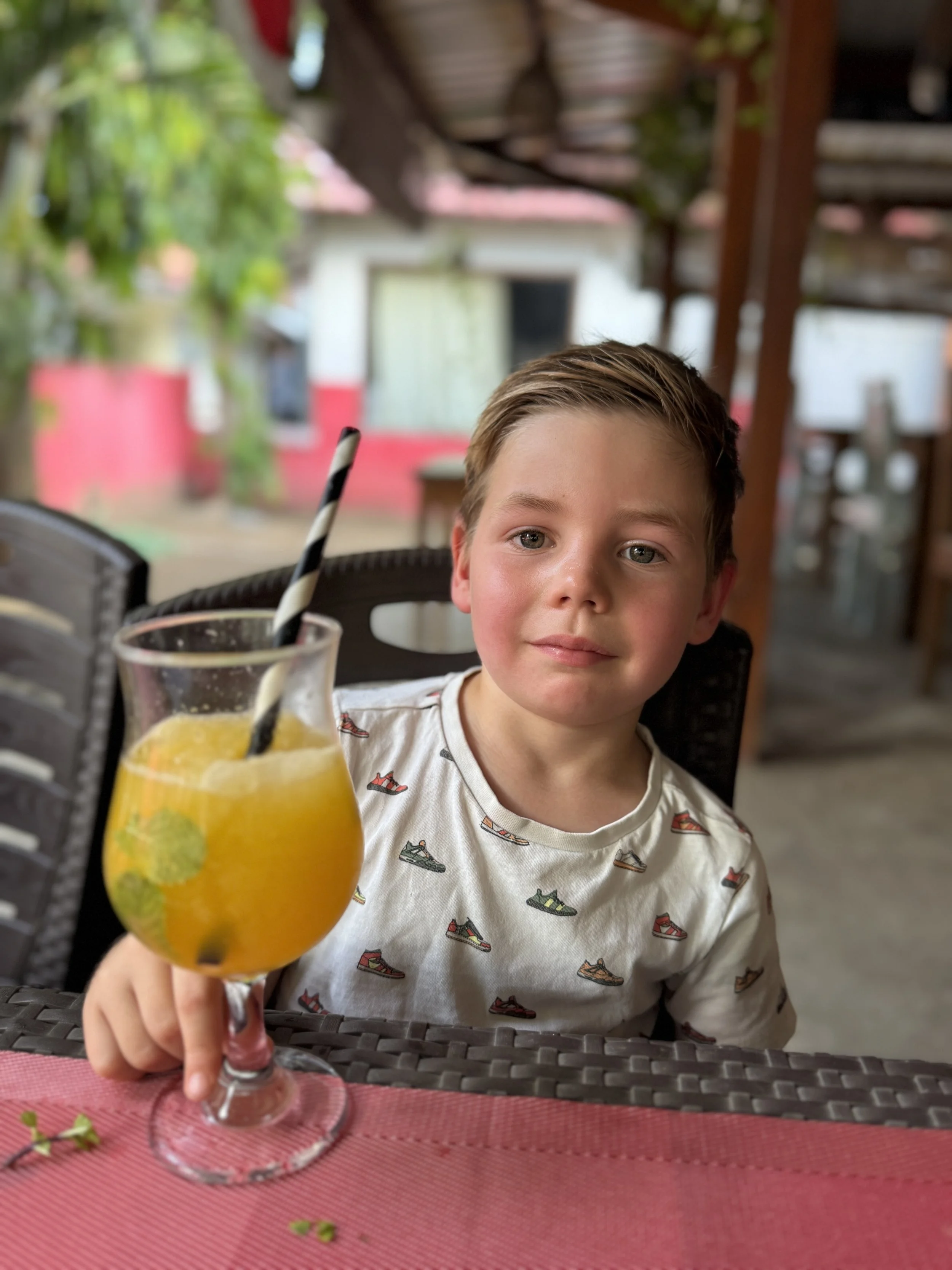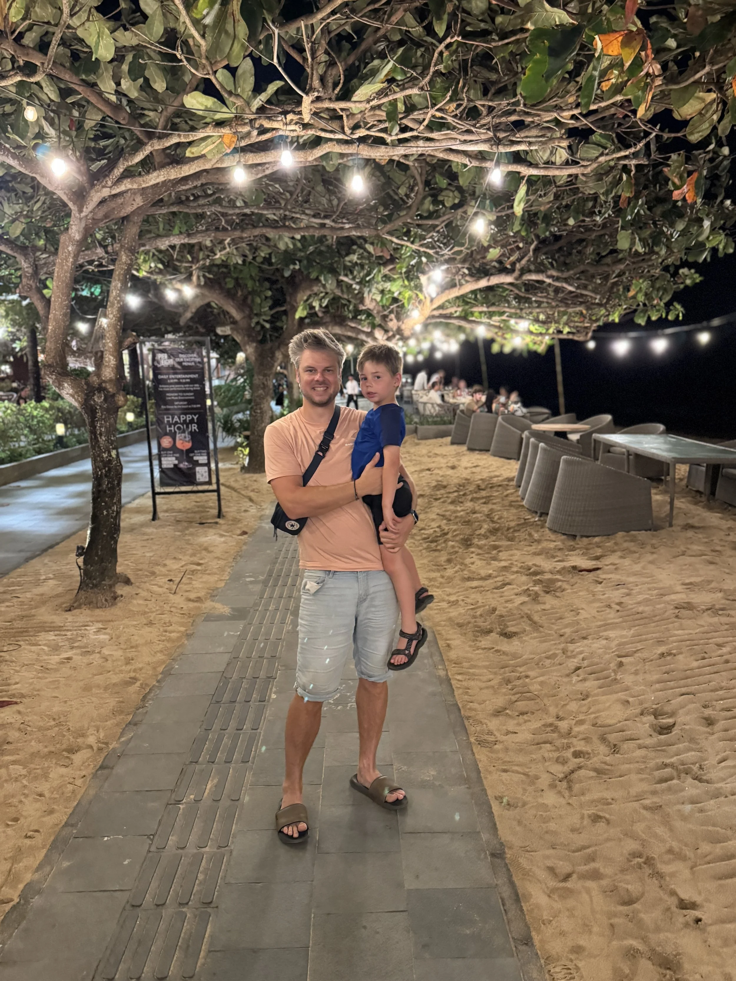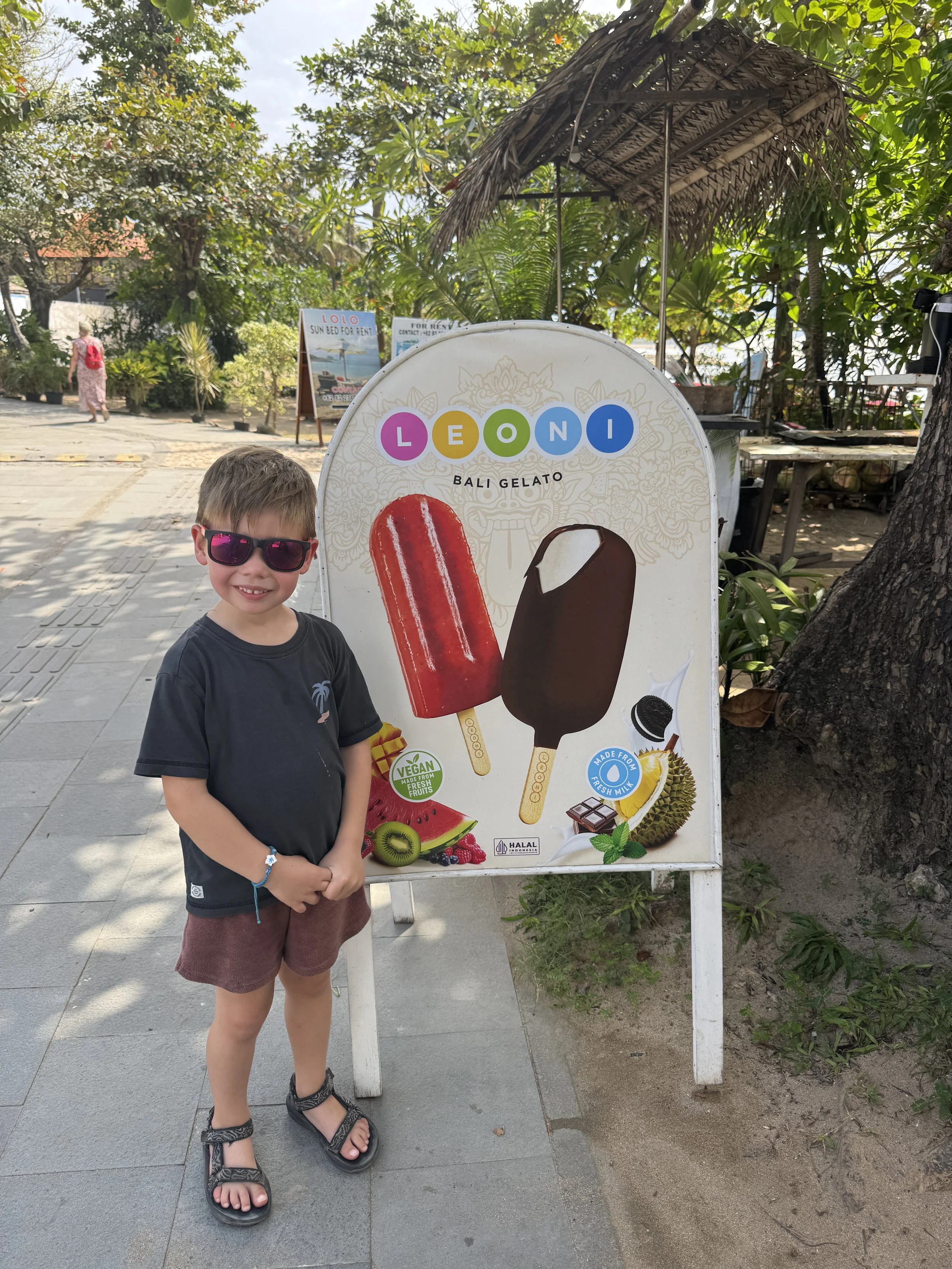 Als we een bordje tegen komen met ‘Leoni’ ijs, is Leon helemaal in de wolken. Het zal niet de laatste keer zijn dat we in Bali Leoni ijs gaan eten 😄. ‘s Avonds gaan we kijken naar een laser lichtshow op het water. Het is eigenlijk niet zo indrukwekkend, en het begint bovendien te regenen - maken dat we thuis zijn!