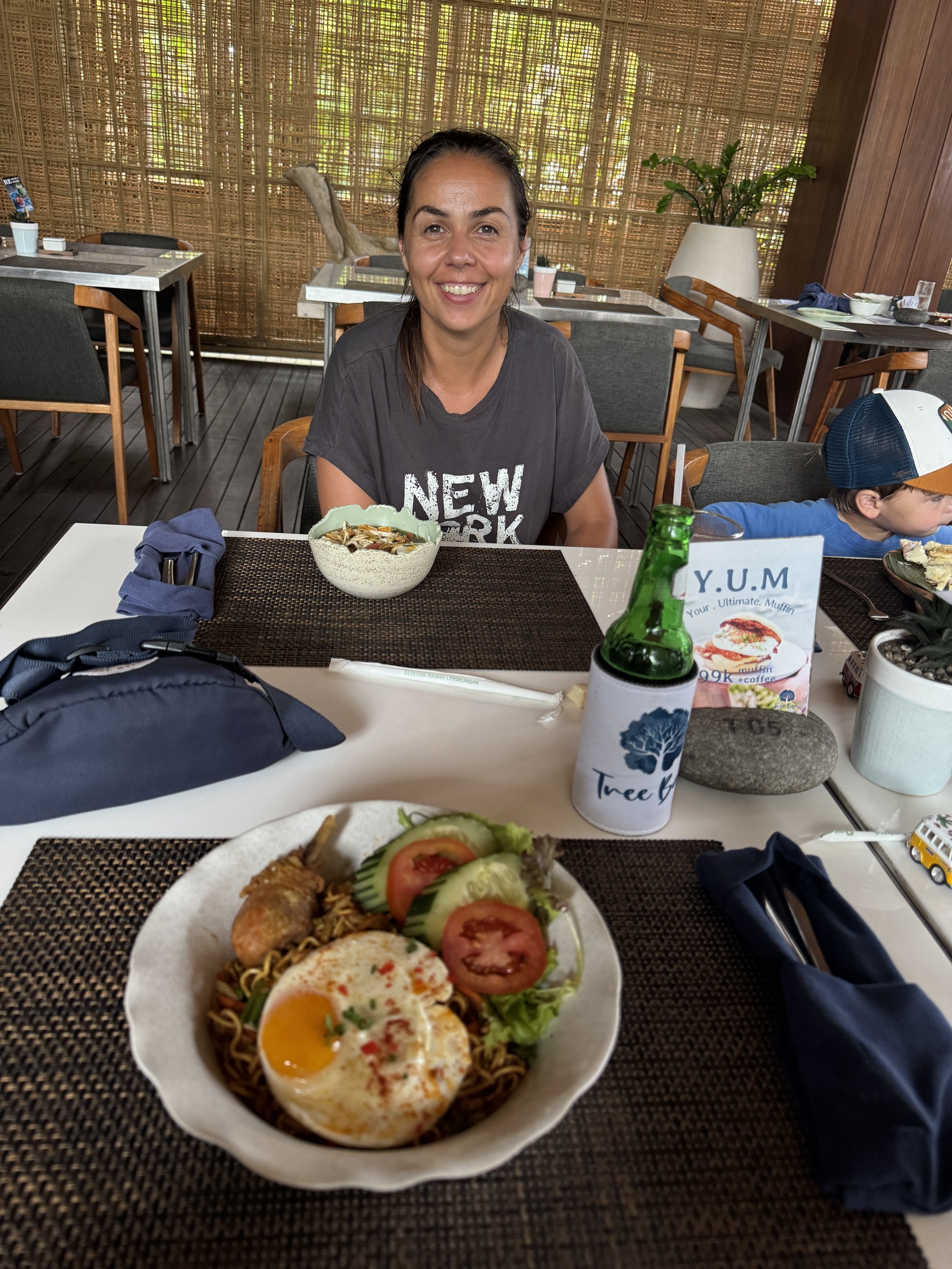 We smeren ons goed in, telkens eerst zonnecreme en dan ‘Mozzie spray’ - tegen de muggen. Bali is Dengue land en dat willen we echt vermijden, en deze muggen steken ook overdag, goed smeren is dus de boodschap!